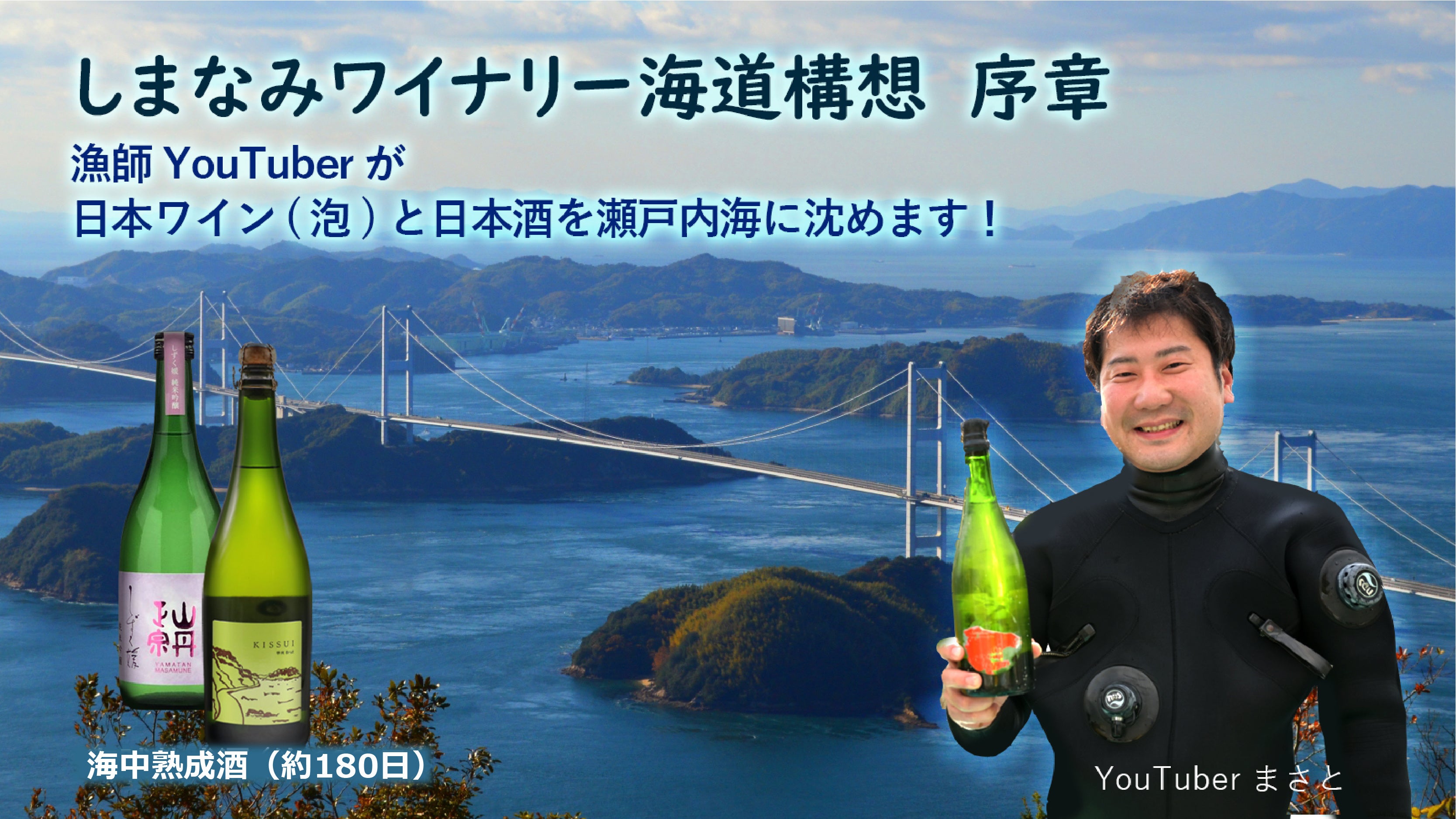今回、愛媛県漁業共同組合津倉支所の組合員でもある人気YouTuber「瀬戸内海の漁師まさと」が自ら400本(予定)を超える日本ワインと日本酒を海に沈めます。半年後に引き上げる予定の酒を、2022年4月25日~7月22日の期間で応援購入サービス「Makuake」にて予約販売を行います。