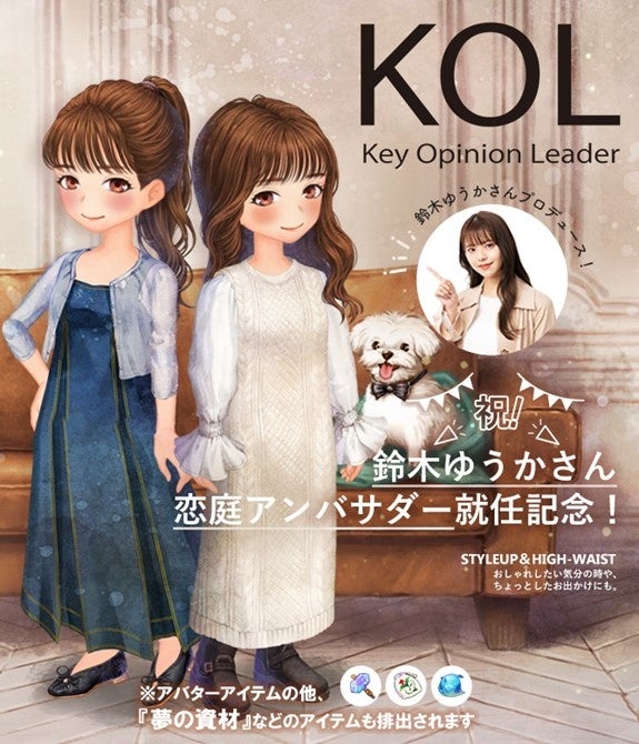 恋庭のアプリ内には恋庭独自の多くのアパレルブランドが存在しており、各アバターをオシャレに着飾るファッションアイテムが揃っています。そしてこの度、恋庭アンバサダー就任記念として、鈴木ゆうかさんがプロデュースするブランド「KOL」のアイテムが登場する「KOLコラボガチャ」を開催します。是非この機会に、ご自身のアバターを可愛く着飾ってみてはいかがでしょうか。