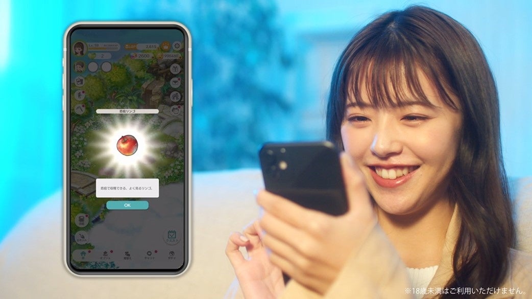 ・ストーリー:満面の笑みでこちらを見つめながら「ねぇねぇ、一緒にゲームしよ」と語りかけてきます。フワフワの部屋着を着てソファで寝ころびながら「やった~マッチした」となんだか楽しそう。「あ!返事きた」「わぁ~リンゴめっちゃ育ててくれてる~」と普段の様々な生活の中で「恋庭」で知り合った相手といつの間にか恋に落ちていくゲーム恋活の様子を再現しております。
