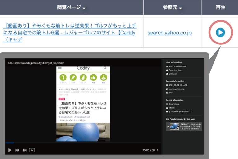 30分前の訪問者の行動が再生できます。ユーザーがどこのページのどの部分をみているのか、ユーザーの目線を追うような機能です。