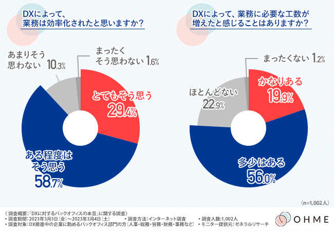 【DXに対するバックオフィス部門の本音】9割近くが「DXで業務は効率化した」と感じている一方、「工数が増えた」と感じている方が75.9%と判明