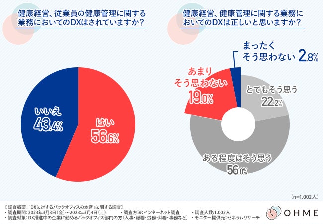 そこで、「健康経営、従業員の健康管理に関する業務おいてのDXはされていますか?」と質問したところ、『はい(56.6%)』『いいえ(43.4%)』という回答結果になりました。