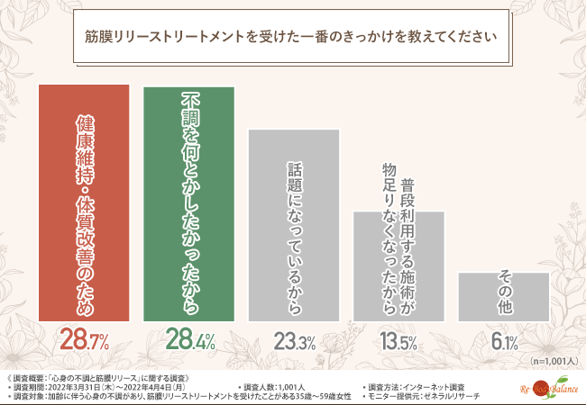 続いて、「筋膜リリーストリートメントを受けた一番のきっかけを教えてください」と質問したところ、『健康維持・体質改善のため(28.7%)』と回答した方が最も多く、次いで『不調を何とかしたかったから(28.4%)』『話題になっているから(23.3%)』と続きました。