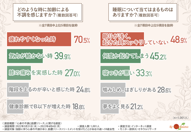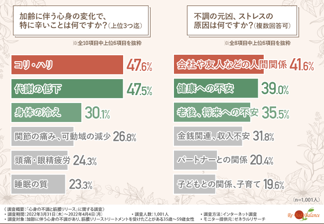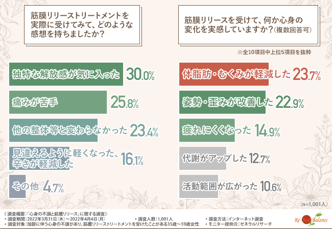 そこで今回、大人のデトックス&スタジオ『Re・Bodybalance』(https://rebody-b.com/)を運営する株式会社シーシーティー協会は、加齢に伴う心身の不調があり、筋膜リリーストリートメントを受けたことがある35歳~59歳女性を対象に、「心身の不調と筋膜リリース」に関する調査を実施しました。