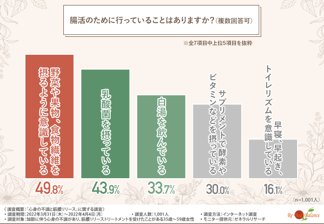 「腸活のために行っていることはありますか?(複数回答可)」と質問したところ、『野菜や果物、食物繊維を摂るように意識している(49.8%)』と回答した方が最も多く、次いで『乳酸菌を摂っている(43.9%)』『白湯を飲んでいる(33.7%)』と続きました。