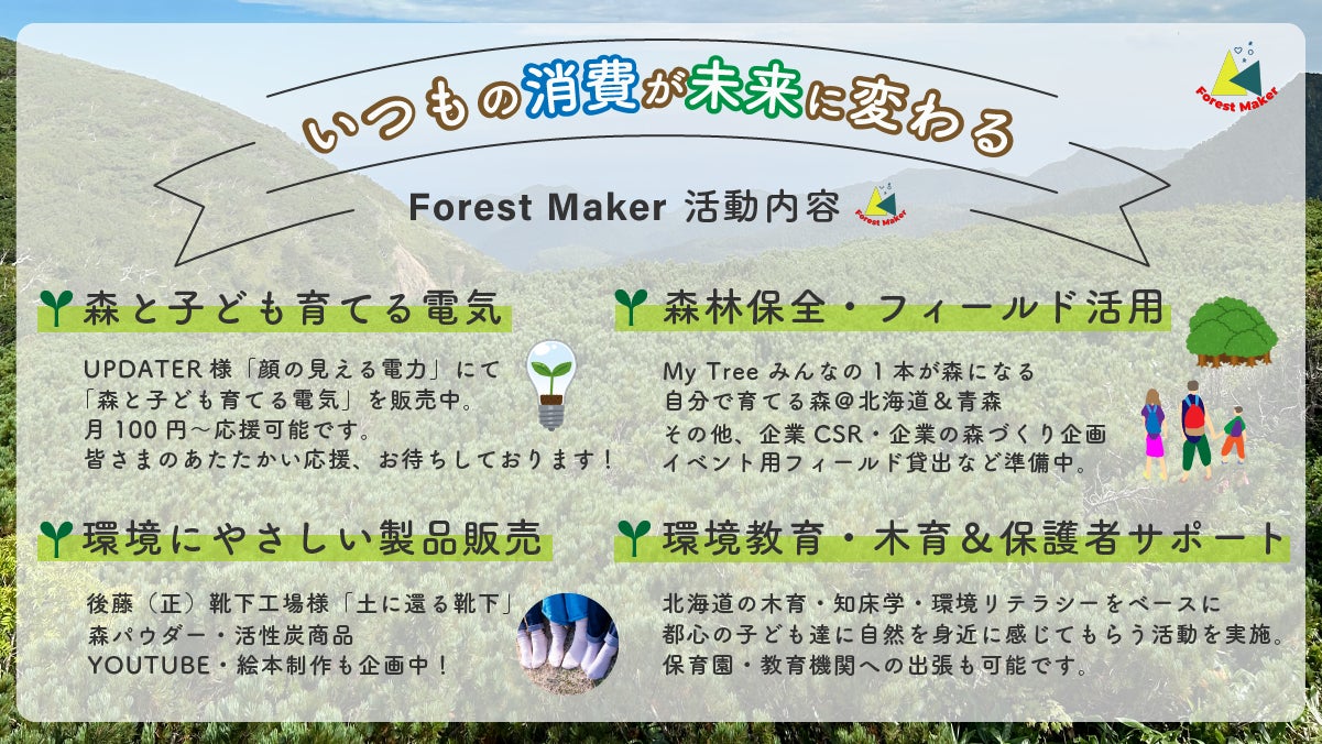 3児の母親である木下氏が、子供達の未来に繋がる事業を起こすべく北海道知床と青森県白神山地で森林を取得。当発電所における売電収入をこれら森林の保全管理に活用。また、間伐材を活用した木育活動イベントなどを通して、自然とのふれあいが少ない都心の親子に自然と触れ合う機会や居場所を提供。森と人の生活が身近に繋がる循環を目指す。