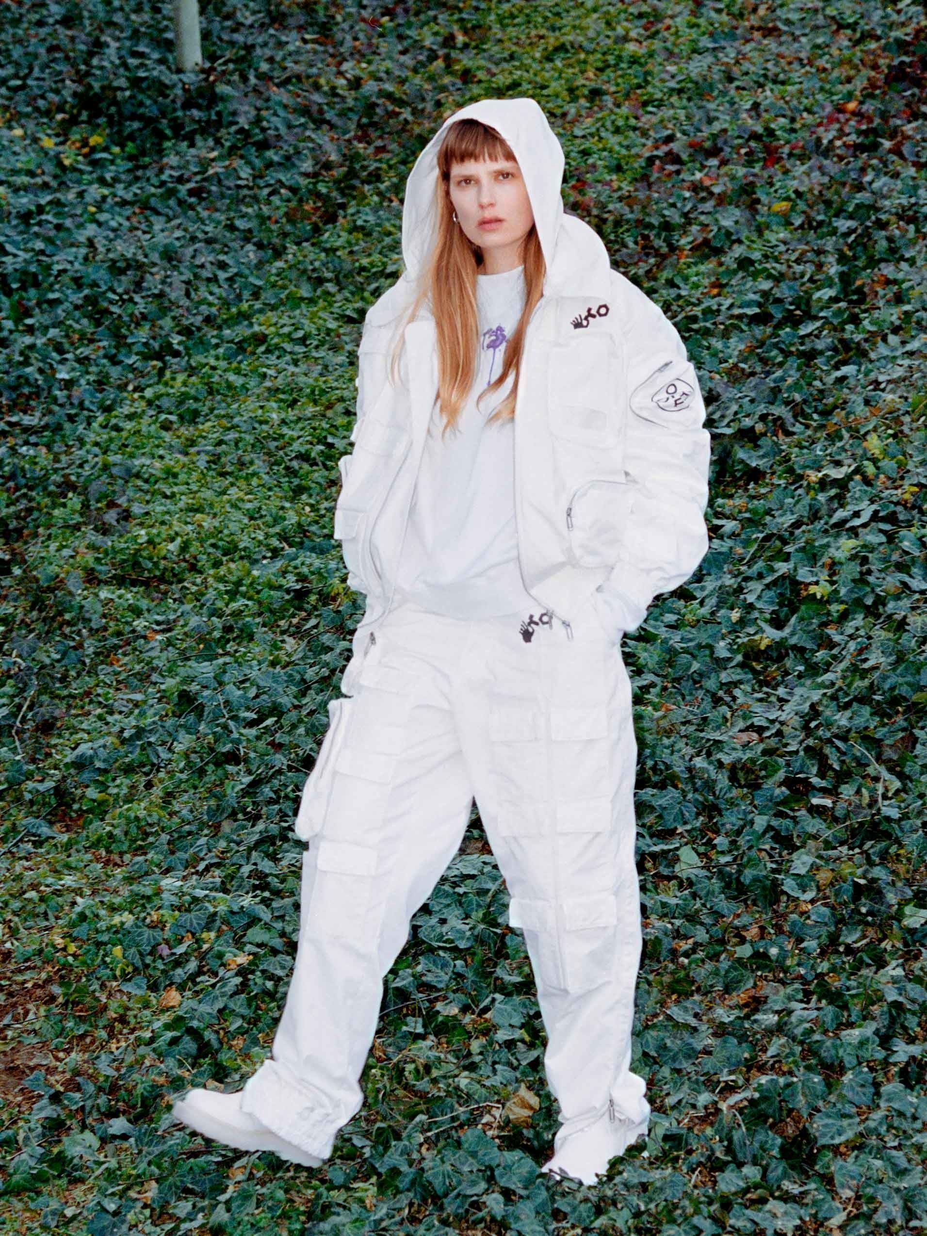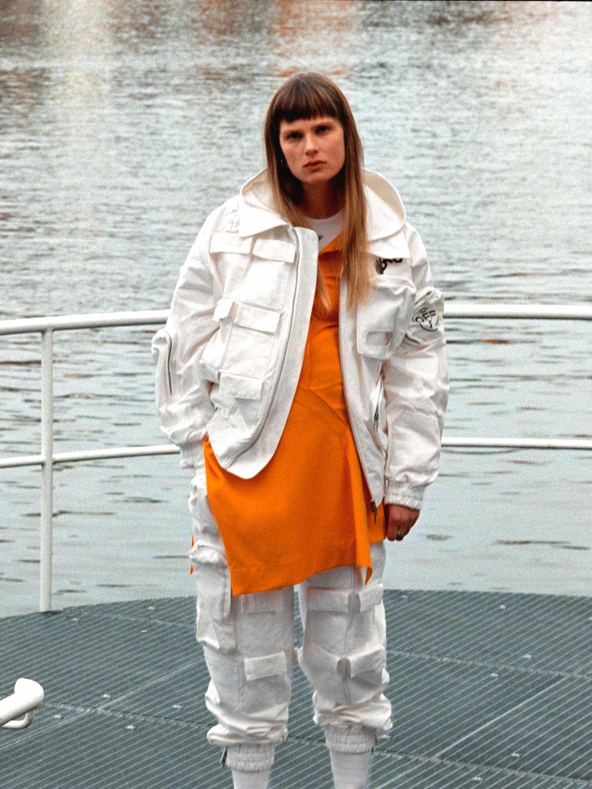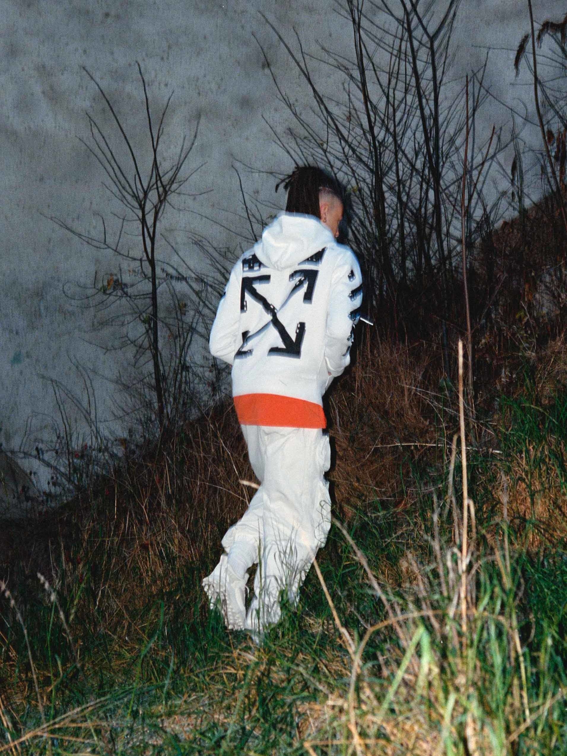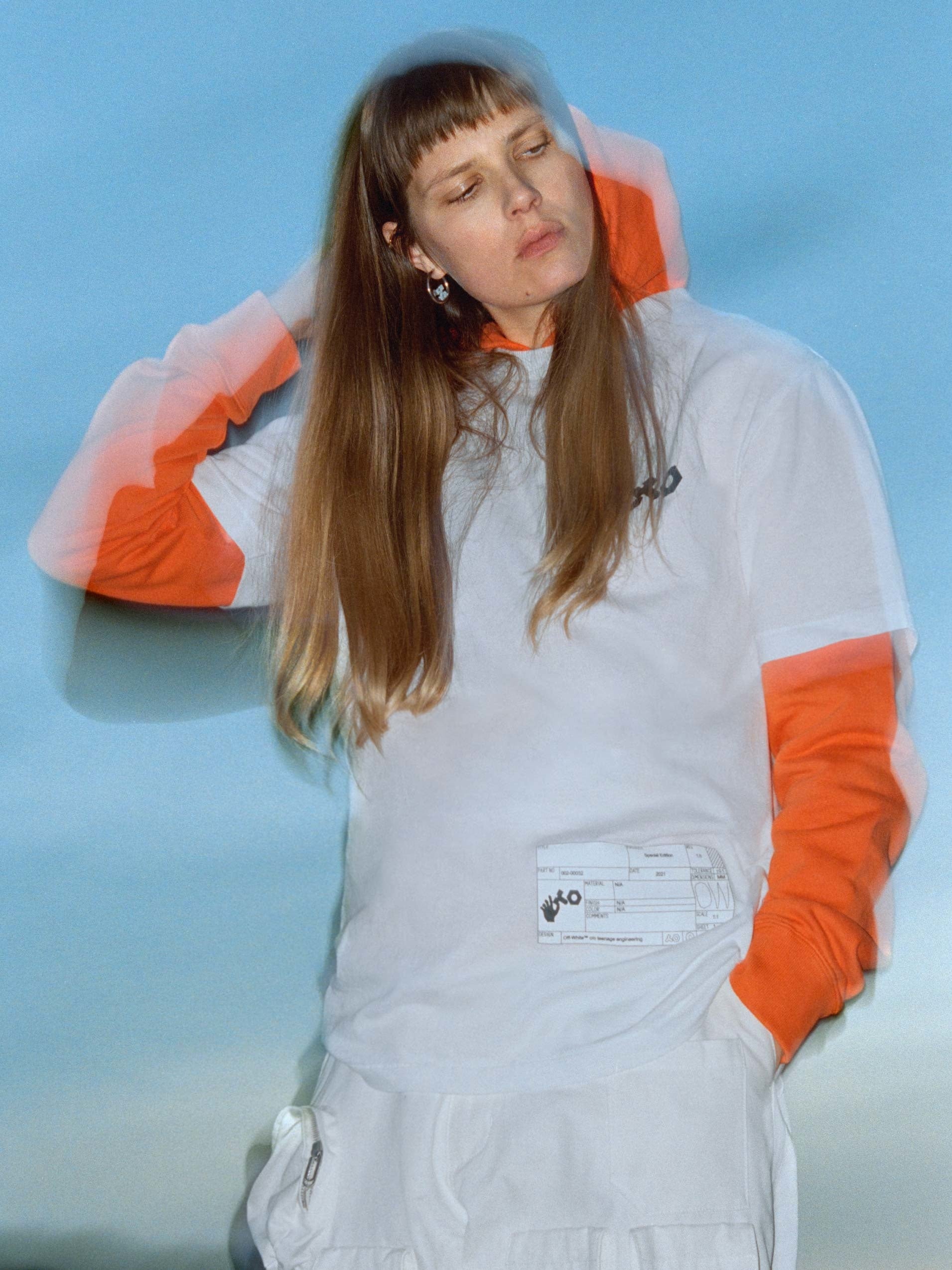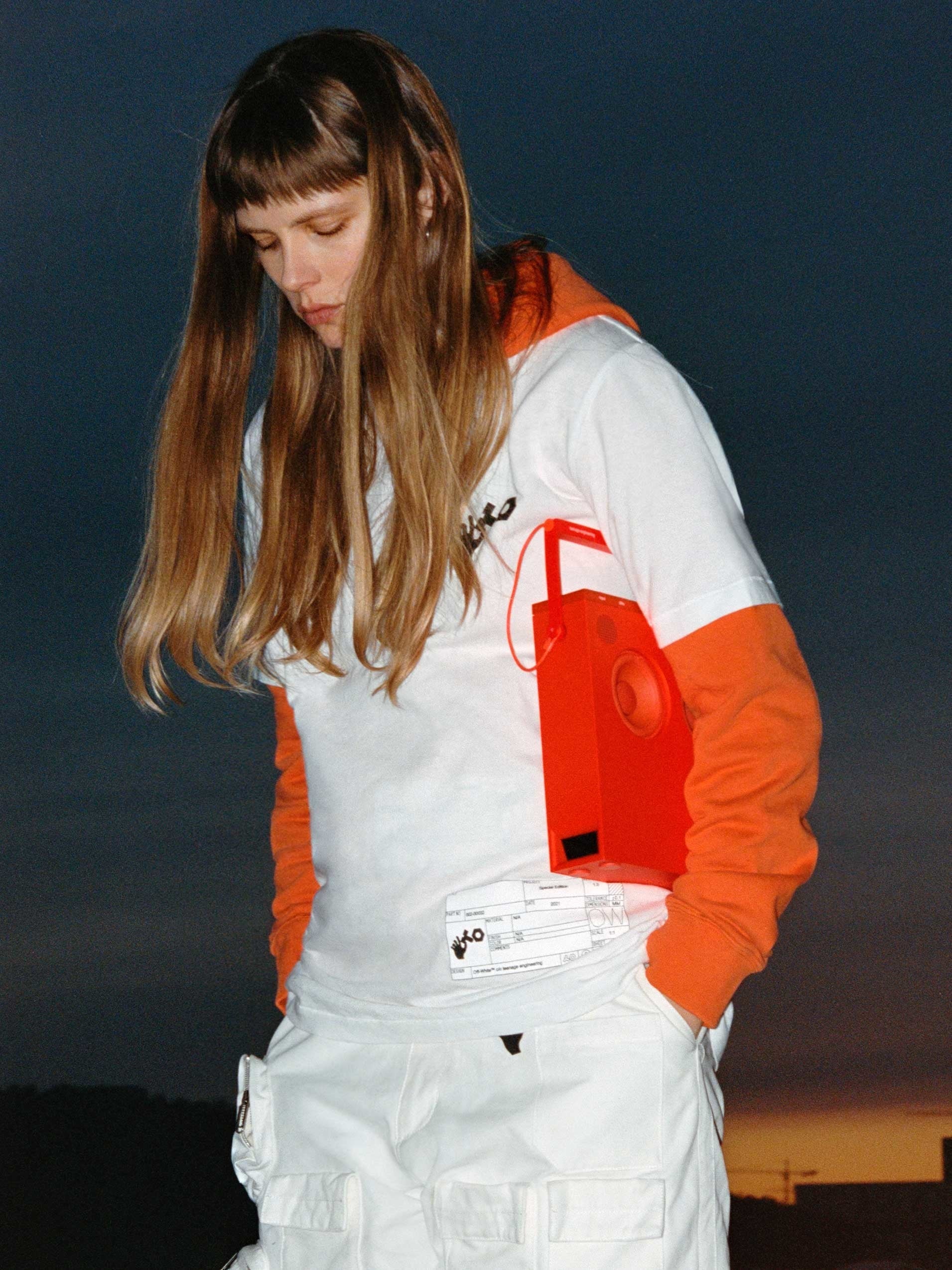 Off-White c/o Teenage Engineeringのコラボレーションでは、アパレルコレクションも展開します。カプセルコレクションは、ホワイトとオレンジのTシャツ、パーカー、セットアップとしても着回せるホワイトのボンバー ジャケットとカーゴパンツで構成されます。
