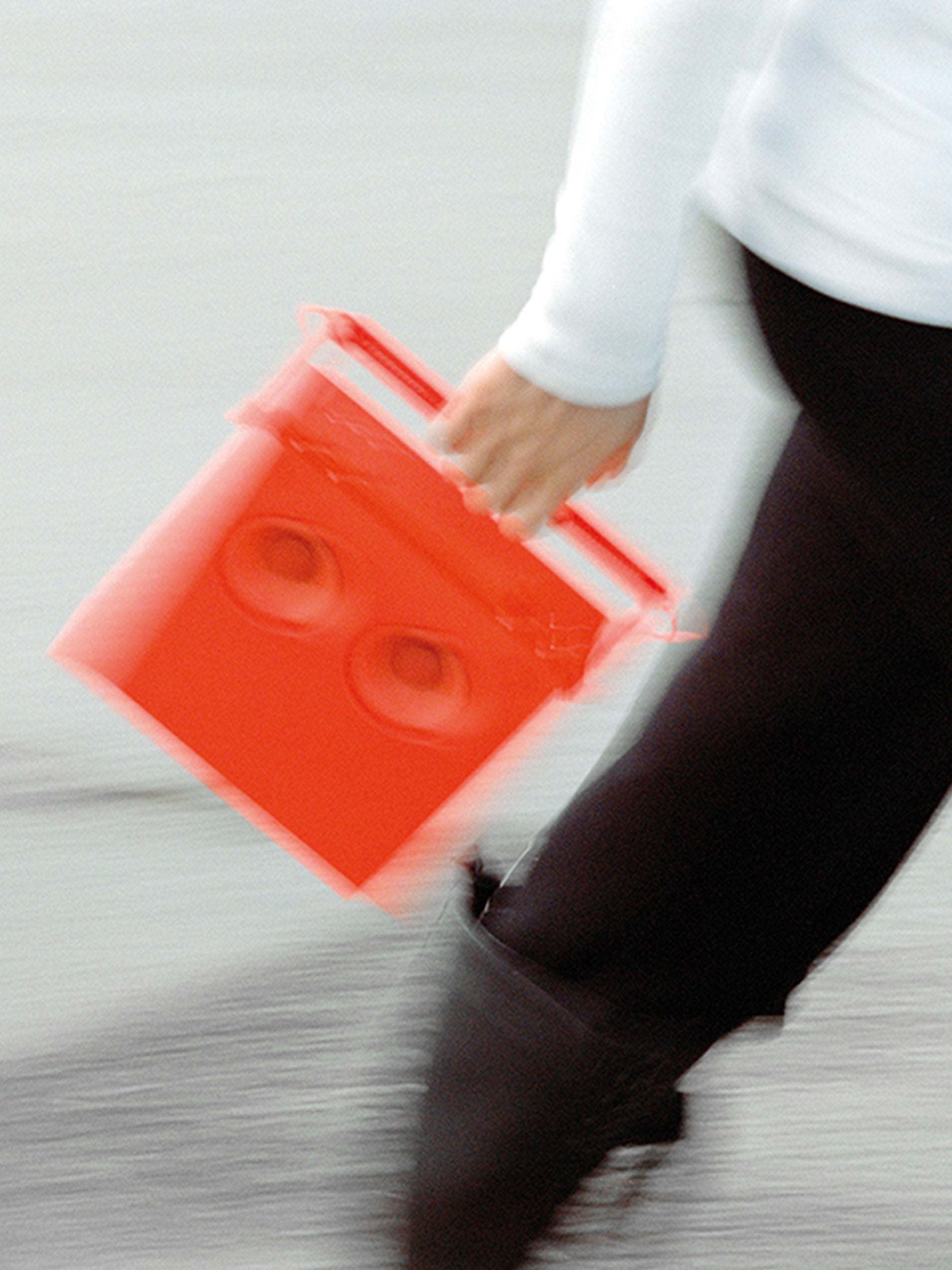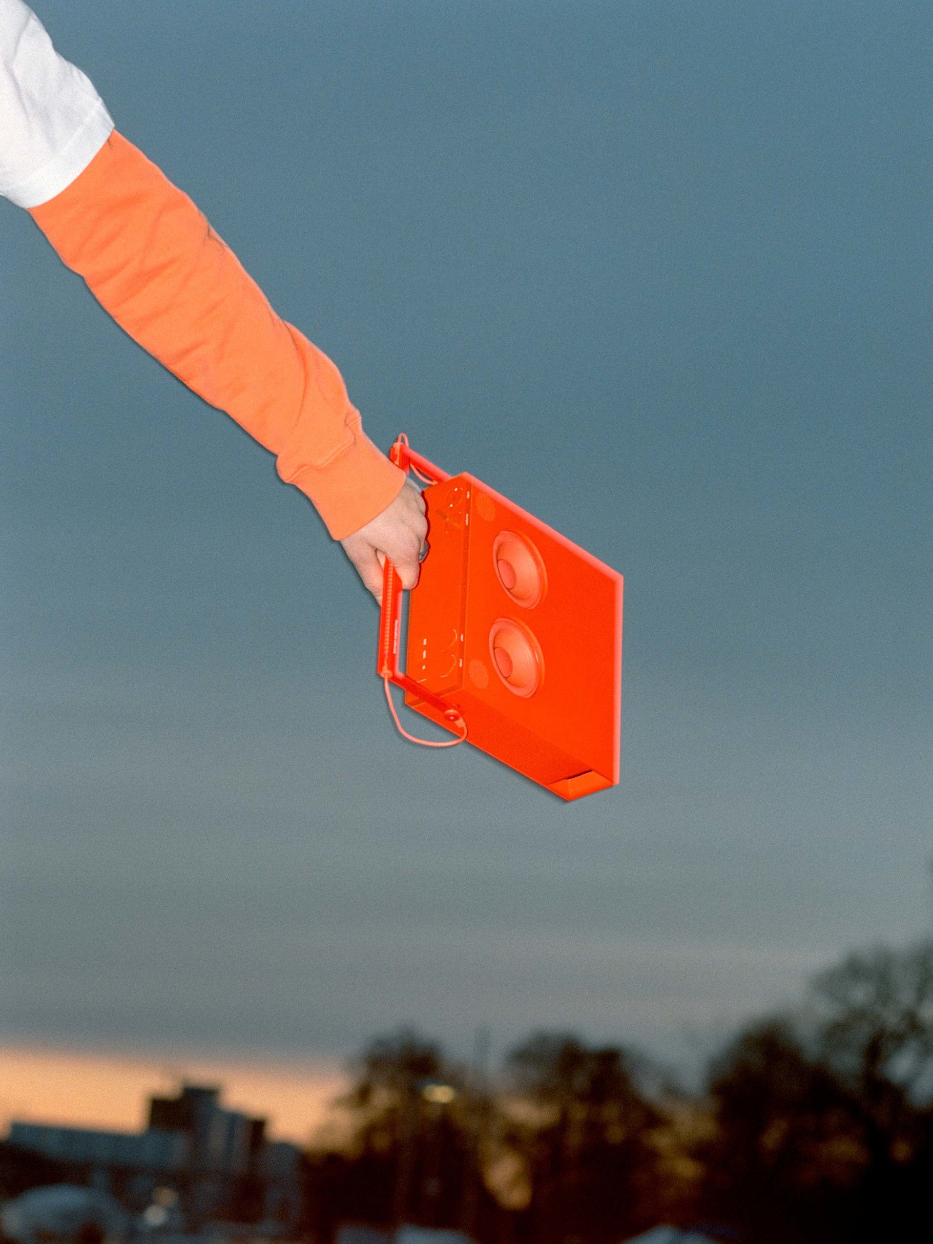 Bluetooth対応の “魔法のスピーカー/ラジオ”として知られるOB-4は、ワイヤレススピーカーとラジオが一体型となっている機械で、ラジオ再生機能だけでなく他にはないディスクモードと呼ばれる機能を搭載しています。 このディスクモードとは、Teenage Engineeringが実験的に搭載したメディア・インストゥルメント機能で、録音したラジオをアンビエント、カルマ、メトロノームといった3種類の音に加工し楽しむことができます。 鮮やかなオレンジ色の外装と背面ロゴに加え、ヴァージル・アブローはこのディスクモードのスペースに、 ガーナのミュージシャンSk Kakrabaが演奏するGyilの音を追加しました。 Gyilはガーナの木琴で、14個の木の鍵盤 をゴム製の槌を用いて演奏する、独特の音を奏でる楽器です。共鳴する為に鍵盤の下にはひょうたんが吊るされており、そこに小さな穴を開け、そのスペースはクモの卵嚢が張られています。Sk Kakrabaは、この楽器の製作 と演奏の両方を行う最後のミュージシャンです。更に、OB-4 Off-Whiteにぴったり合うようにカスタムデザインされた、ショルダーストラップ付のオレンジ色のPVCのバッグが付属します。
