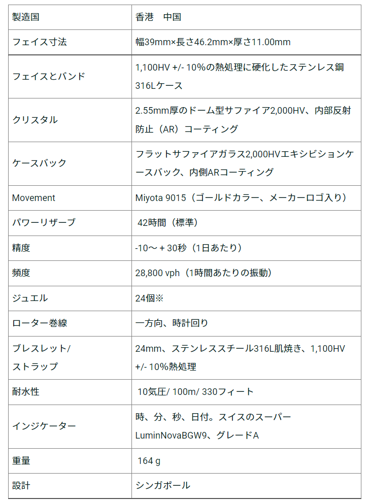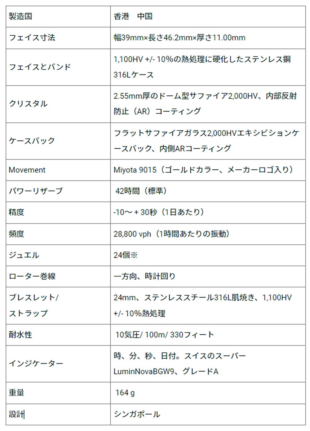 Movement:Miyota 9015(ゴールドカラー、メーカーロゴ入り)