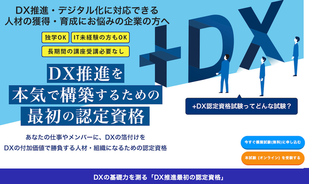 「+DX」認定資格には認定試験の受験が必要となります。試験範囲や試験のレベルがわからないという方のために模擬試験をご用意します。本番の試験と同じ出題範囲・レベル・出題形式で今すぐ模擬試験を受けてみることができます。なお、模擬試験は無料ですのでまずはトライしてください。