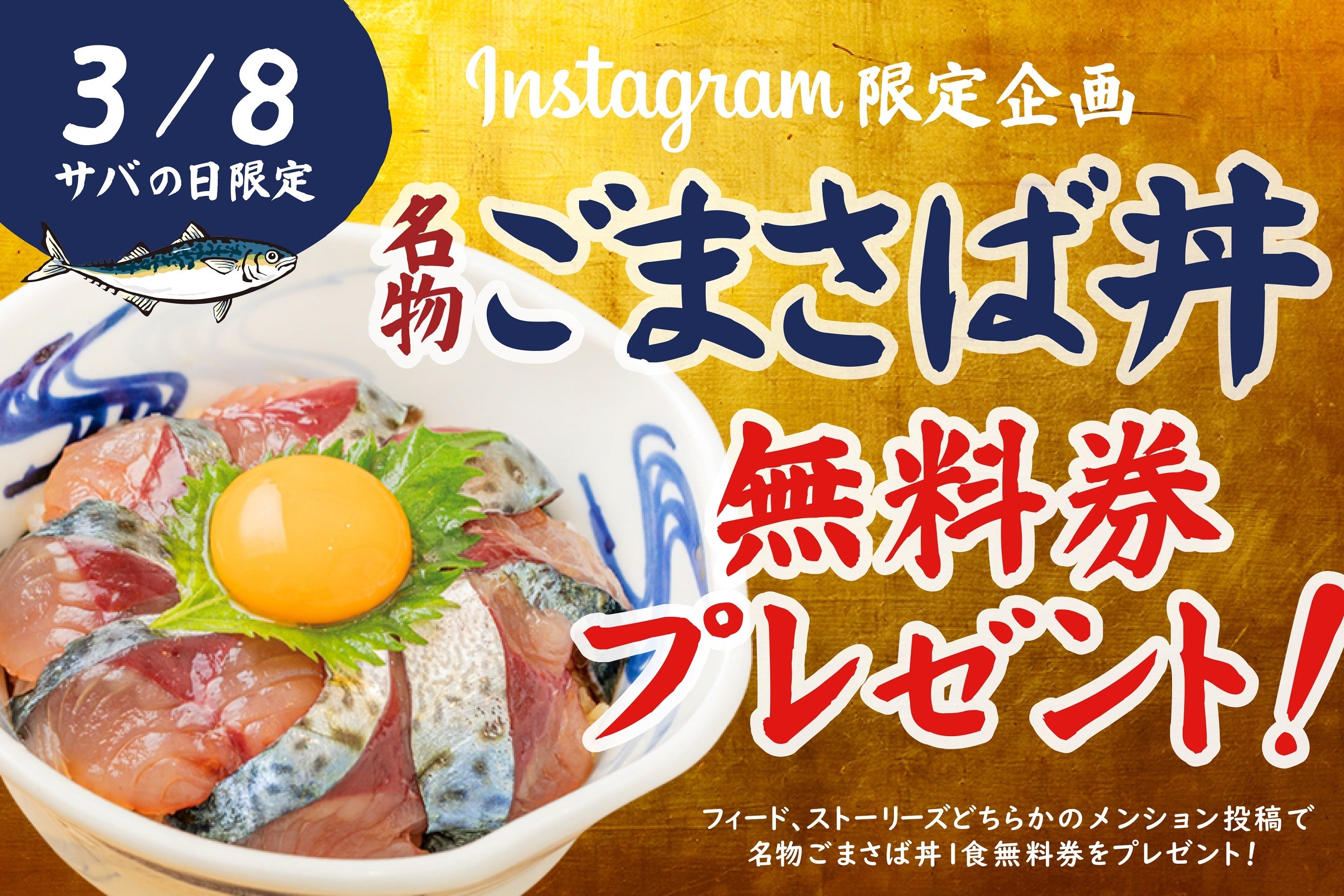 2022年3月8日(火)の【サバの日】を記念して、3月8日(火)当日のイートイン利用時に『いまがわ食堂』の公式Instagramアカウントをフォロー&メンションいただいたお客様に限り、「名物!ごまさば丼 ~醤油だれ~」(通常780円)が1食無料となるサービス券のプレゼントキャンペーンを実施いたします。
