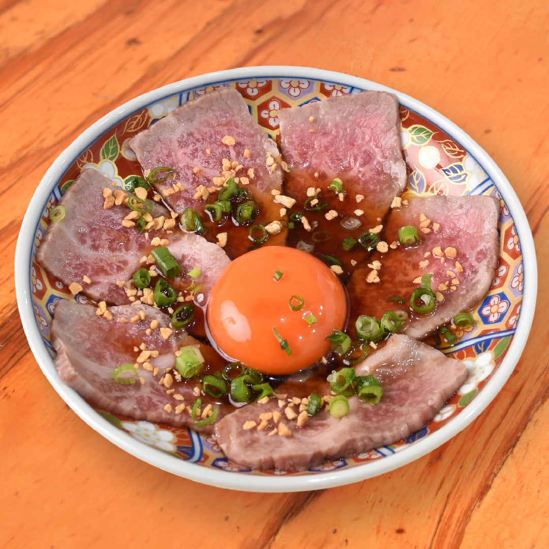 近江牛の赤身肉を低温調理し薄くスライスし、高級赤玉子「高砂の夕日」、葱とガーリックチップをトッピングしました。濃厚な卵黄と特製タレが絡み、お肉の旨味を引き立てます。当店自慢の近江牛を是非ご堪能ください!