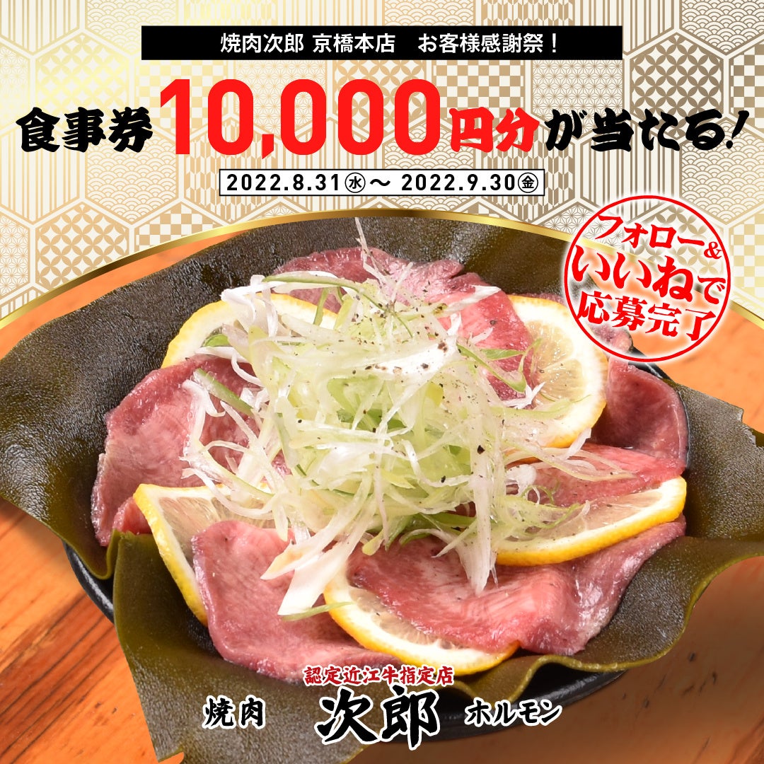 焼肉 次郎 京橋本店では、日頃のご愛顧に感謝して抽選で10名様にお食事券1万円が当たるキャンペーンを実施中!詳しくは、公式インスタグラムアカウントよりご確認ください。
