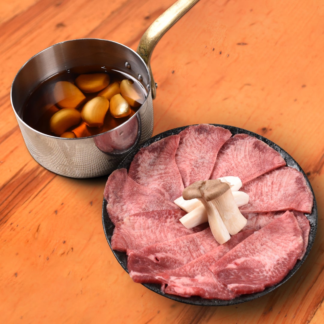 ニンニクたっぷりの特製オイルに、牛タンをしゃぶしゃぶ風に火を通して召し上がって頂きます。牛タンとニンニクやキノコは絶妙なバランスで病みつきに!