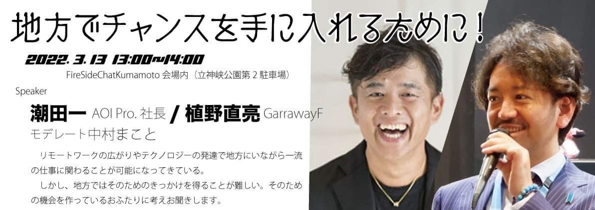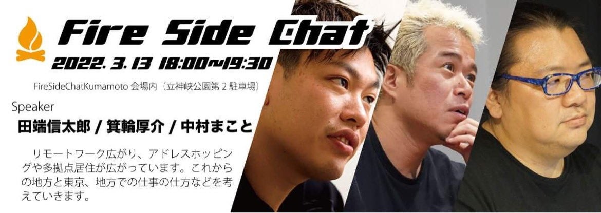 人の密集を避けるための都市部を中心としたテレワーク拡大や生活様式の変化をチャンスと捉え、熊本でのワークライフバランスの取れた住環境や優れた企業誘致政策・ワークスペースの盛り上がりなどを広く広報を行い、コロナ禍をきっかけに広がるワーケーション誘致やオフィスの移転やワーキングスペースの利用で熊本を訪れる人を増やし、地域の活性化と企業誘致につなげることを目的にFireSideChat熊本2022を2022/3/12 氷川町立神峡公園周辺を会場に開催します!
