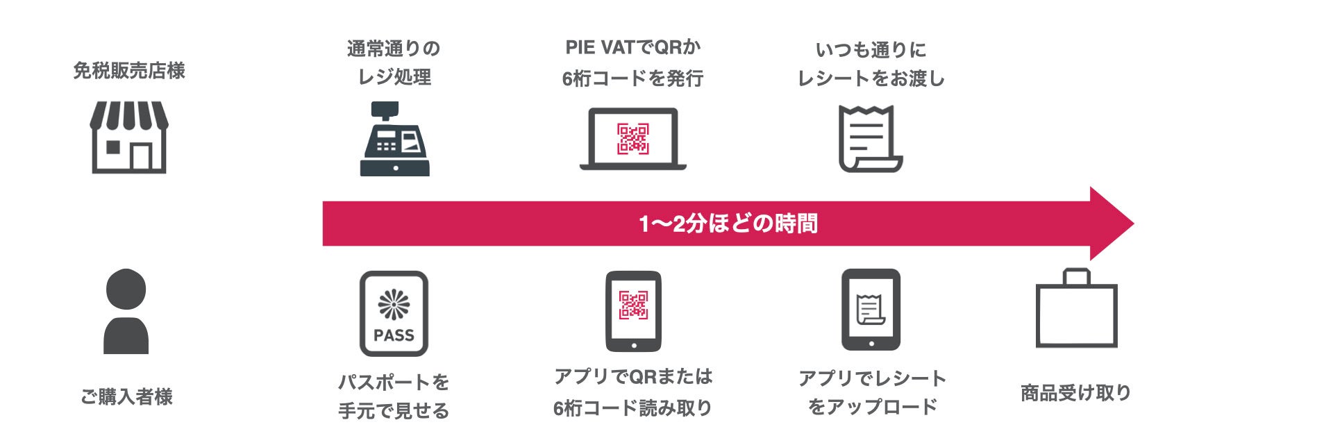 Pie Systems提供のサービス・アプリ「PIE VAT」は、旅行者に対して、VAT還付手続きを全て1つのアプリで提供します。パスポートや入国許可証の情報を事前にダウンロードしたアプリに登録することで、従来旅行者がお店に行く都度行っていたパスポートや入国許可証のスキャンは不要で、商品購入後にお店が提示するQRコードから情報を登録(アプリでレシートをアップロード)し、店舗の方に免税手続きの完了を確認していただくだけで免税手続きが完了します。PIE VATは、免税手続きを全てコンタクトレス(非接触)で行え、一件あたり1~2分で完了します。また、通常は手続き完了後10分以内にVATが還付されます。