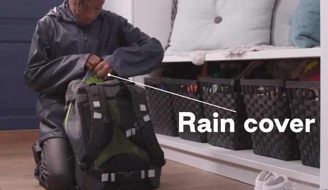 使用中に突然の雨が降っても中の荷物が濡れないよう、底部ポケットにレインカバーを内蔵。カバーの生地は撥水加工が施されている他、悪天候でも目立つように蛍光色が採用され、反射パッチも豊富に配置されています。