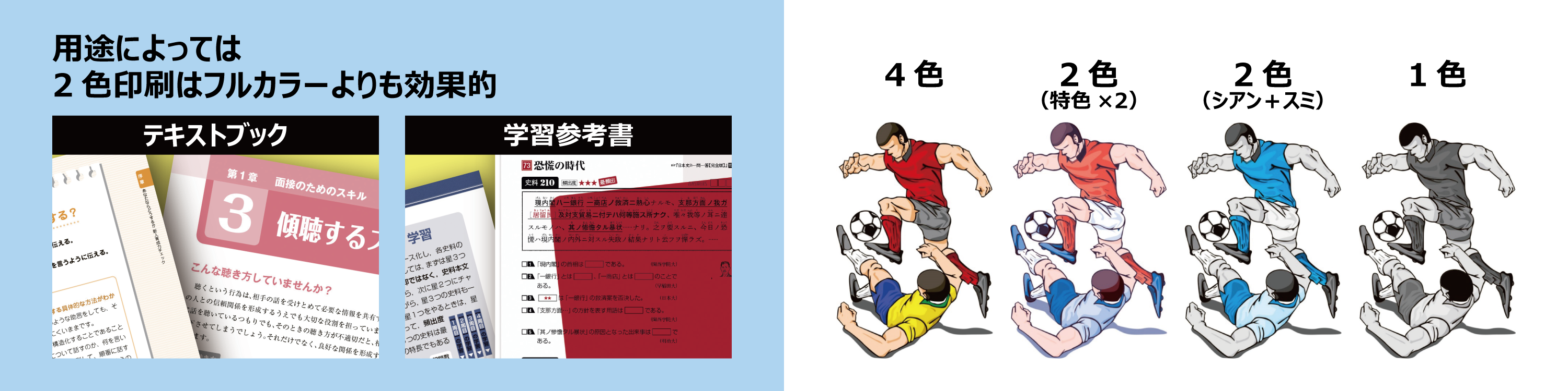 テキストブックや学習参考書など「読んで理解する」ことが重要になる印刷物には2色印刷が最適です。2色印刷はフルカラーよりも見た目が散漫になりにくいため、シンプルかつまとまりのある誌面が制作できます。これまで4色で印刷していた印刷物も2色での表現ができないか、ぜひご検討ください。