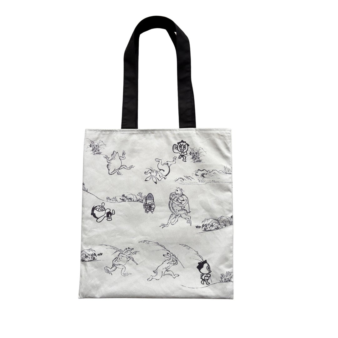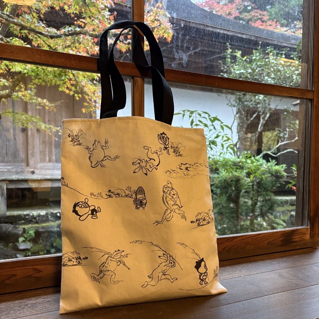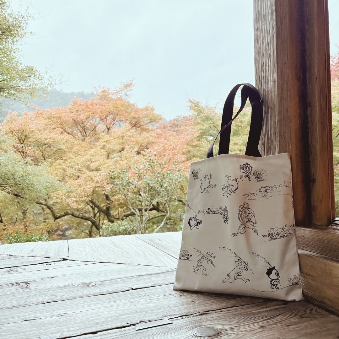 デザイン、プリント、生地の選定など、企画から二年の時間をかけ、ついに実現した待望のコラボレーションバッグ。国宝「鳥獣人物戯画 甲巻」の世界に「ひよの山」たちが入り込み取組などをしているのは、公式商品ならではの楽しさが溢れています。