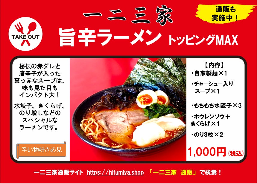 自宅での食事の機会が増えた新しい生活様式に合わせて、「一二三家」も店舗経営のみならず早々にラーメンの冷凍化に成功させ、通販サイト(https://www.hifumiya.shop/)にて販売を開始。
