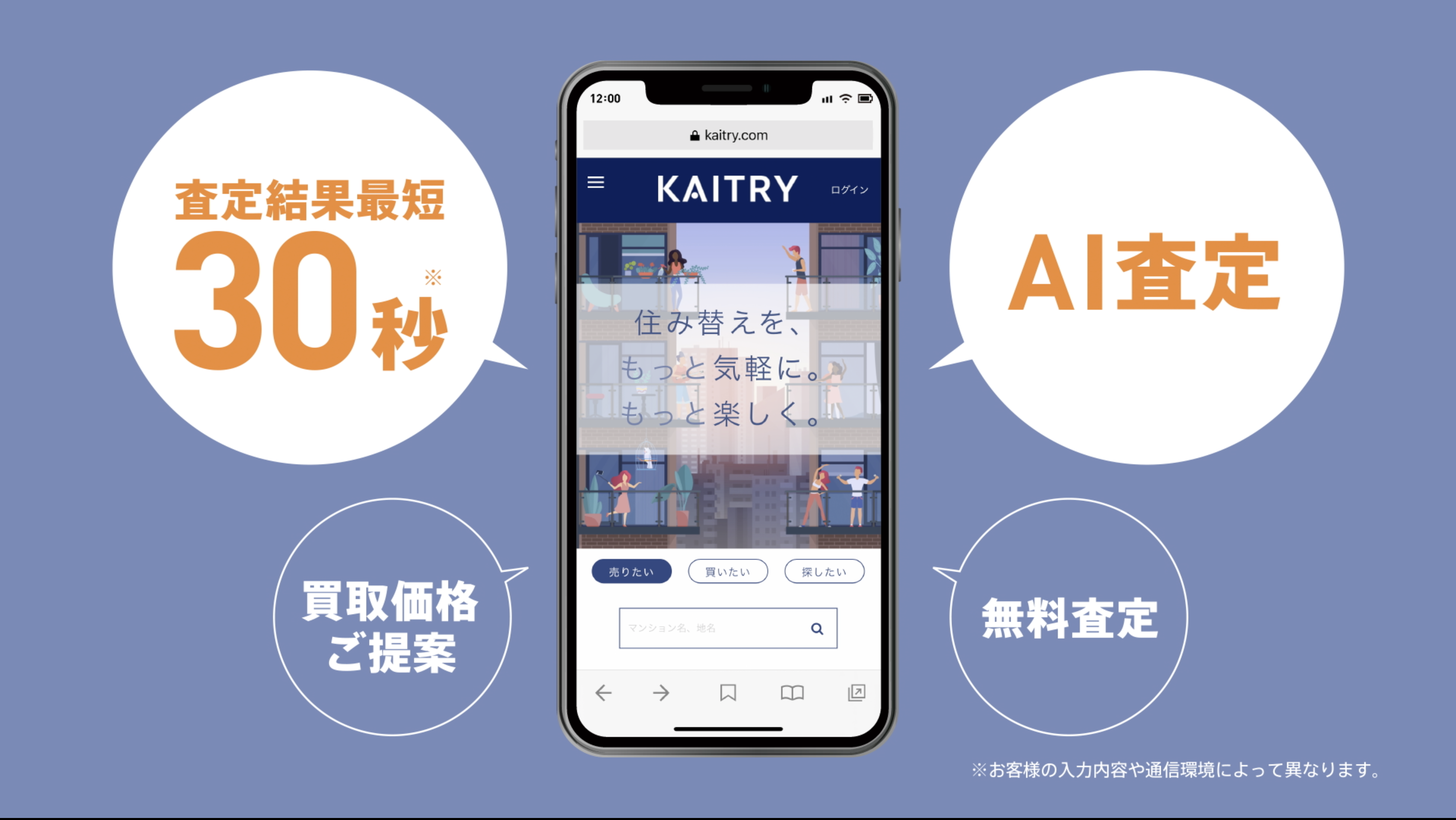 今回のテレビCMのコンセプトは、「最短30秒のAI無料査定」と「直接買取」という二大特徴をアピールするとともに、”マンション売るなら『KAITRY』“を皆さんに知っていただくことです。