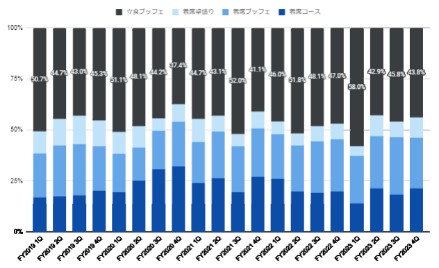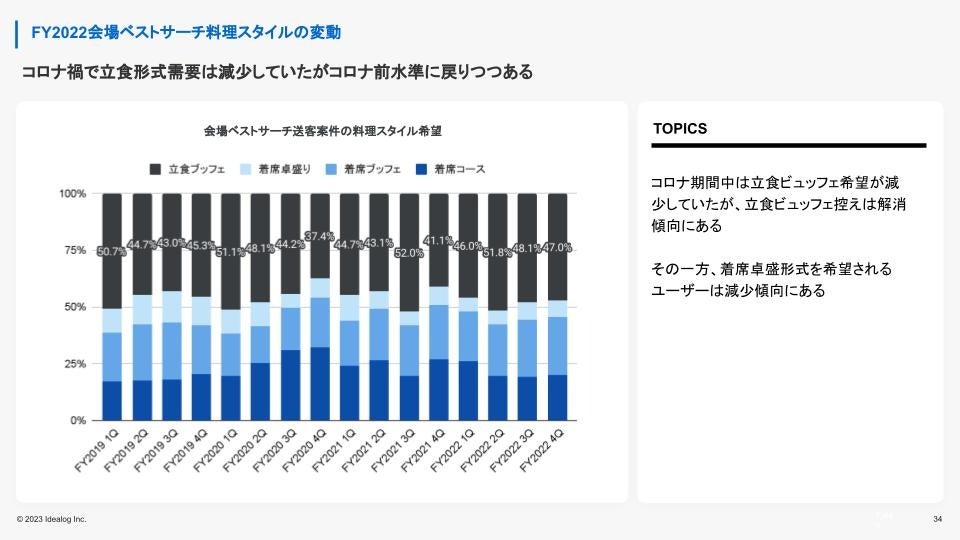 コロナ期間中の2020年~2022年は法人・団体のパーティー利用数は激減。パーティー実施を控える状況が続いていましたが、2022年後半より急上昇。5類への移行も進んだことで2023年は2019年の水準を上回る利用者数となりました。コロナ要因で「宴会・パーティーを控える」法人・団体が大きく減少したと考えられます。