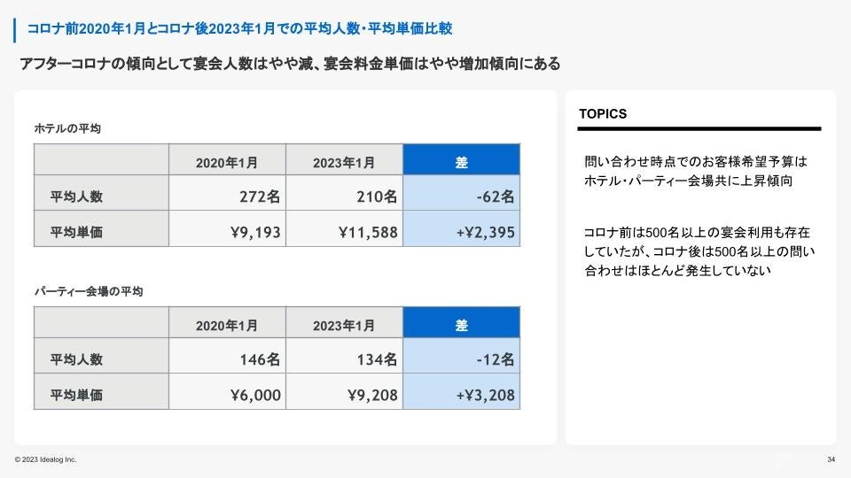 パーティーの問合せ段階での平均人数についてはコロナ前の2019年に比べて1~2割減。