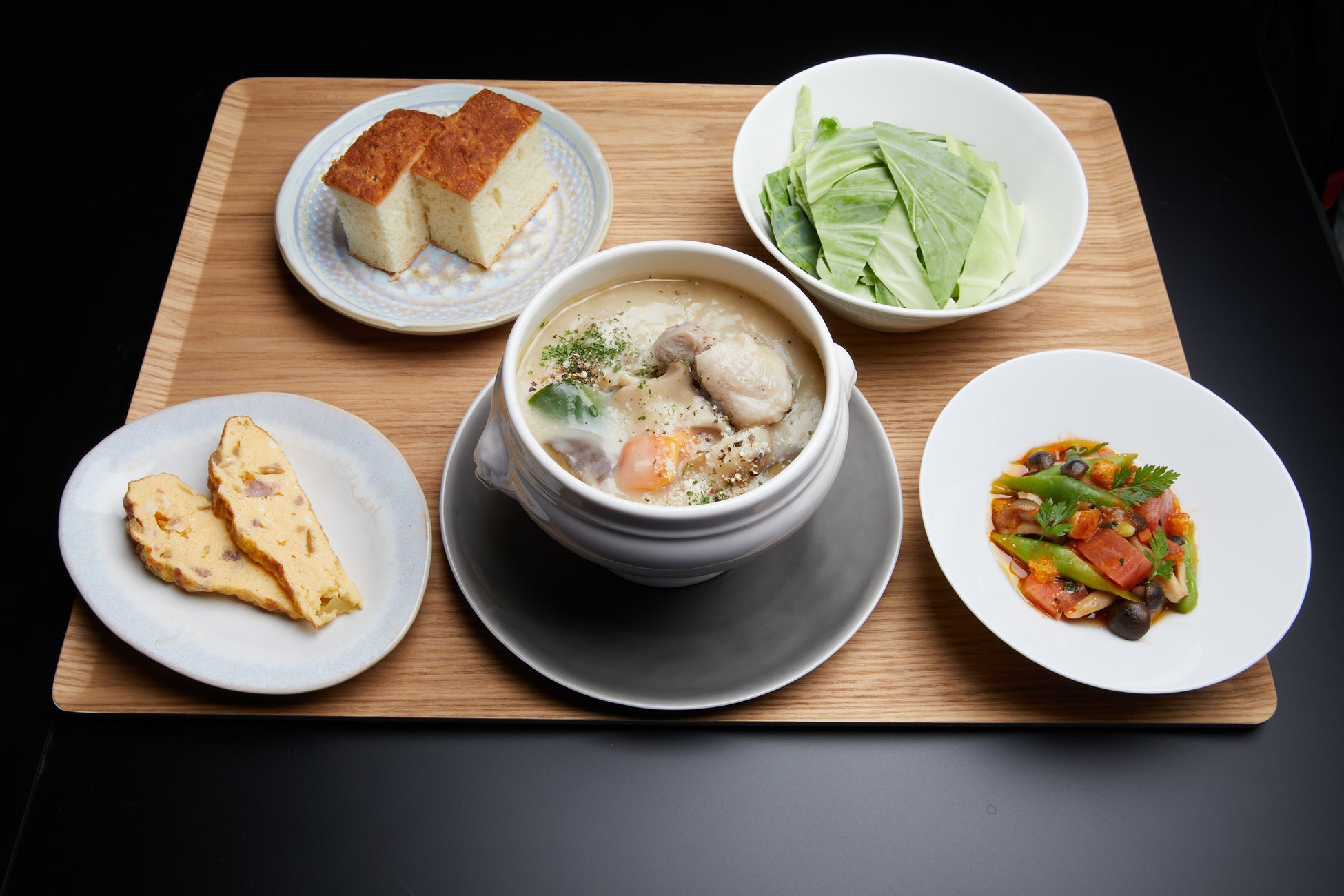 【内容】4種の鶏肉(柔らかく炊いた骨付き肉、モモ肉、ムネ肉、つくね)、野菜盛合わせ