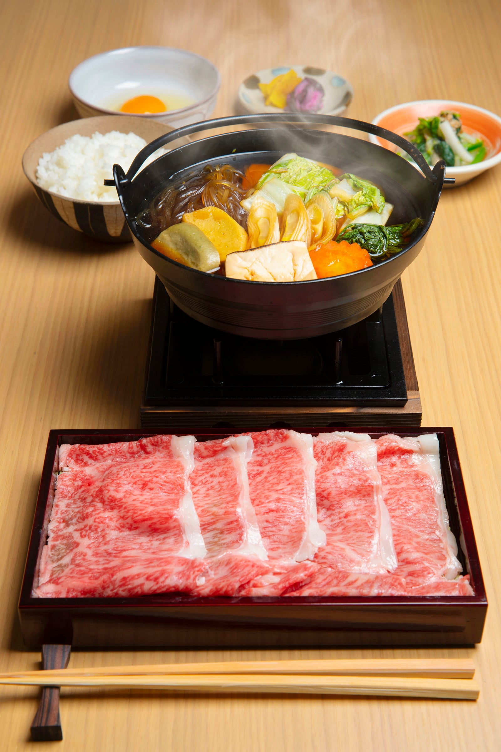 すき焼き、季節小鉢、卵、ご飯、香の物