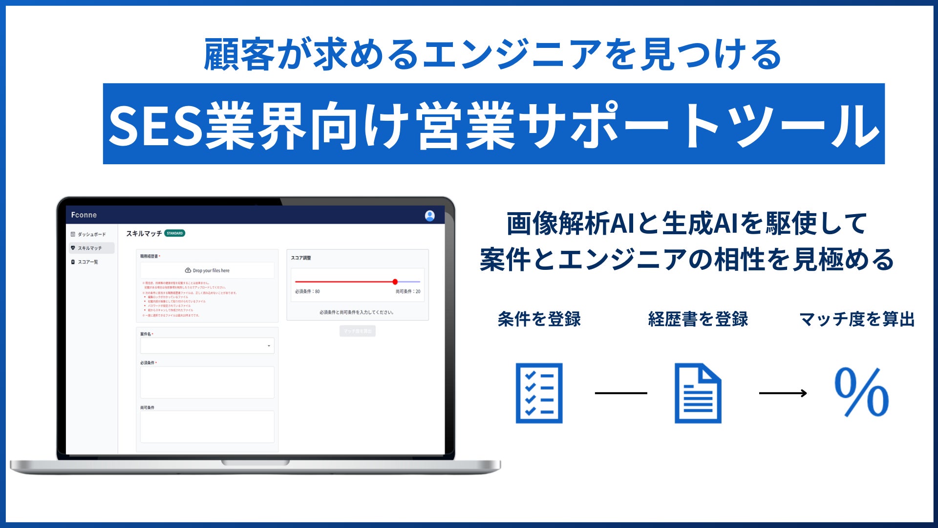 SES企業や派遣企業の営業は、効率を上げるために、様々なサービスを活用したり、自社で構築したりと、DX化を求めております。FTSは他社にはない全く新しいAIマッチングシステム、「Fコネ」を開発しました。