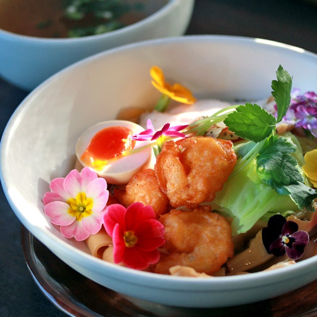 ・らー麺 藤原家さま/【花まつり限定】エディブルフラワーが飾られた「海老塩つけ麺 仏陀と華」