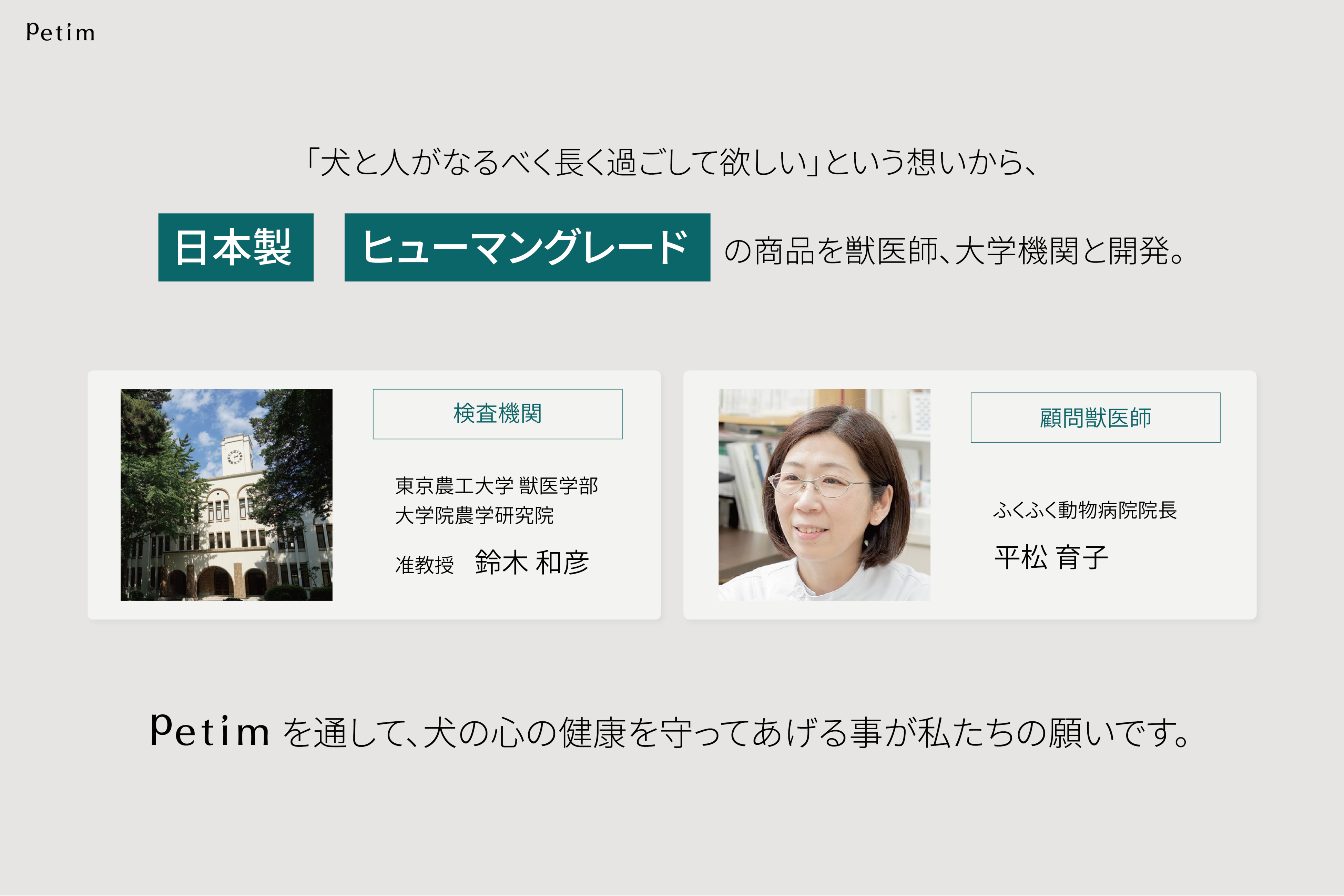 Petimは、「愛犬とのかけがえのない時間を出来るだけ長く過ごして欲しい」という想いから、日本製・ヒューマングレードの商品を獣医師、大学機関と開発しました。