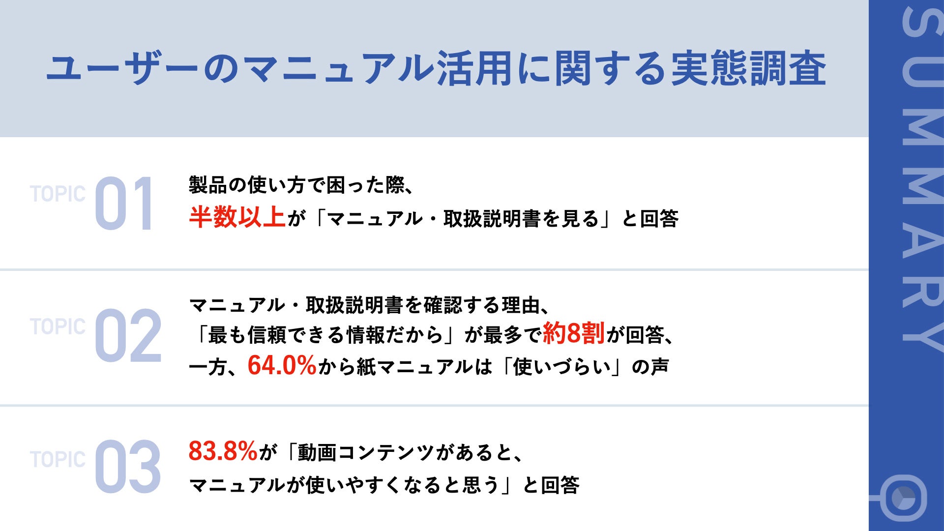 今回の調査では、ECモール利用者にとって、紙媒体のマニュアル・取扱説明書は使いづらいと感じられている実態が明らかとなりました。最近では、取扱説明書を確認せずとも直感的に使えるよう設計されている商品が増えてきていることが要因として挙がりましたが、紙媒体の取扱説明書は場所をとる・分かりづらいとも感じられているようです。その一方で、使い方に困った際には、メーカーが発行している商品に付属する取扱説明書が最も信頼できる情報であると、取扱説明書を確認する人も多く、マニュアルは幅広い利用者に求められていることが分かりました。ペーパーレス化が進む現代においては、商品マニュアルの動画化は、利用者のニーズを考えるメーカーとして必要な対応と言えるのではないでしょうか。