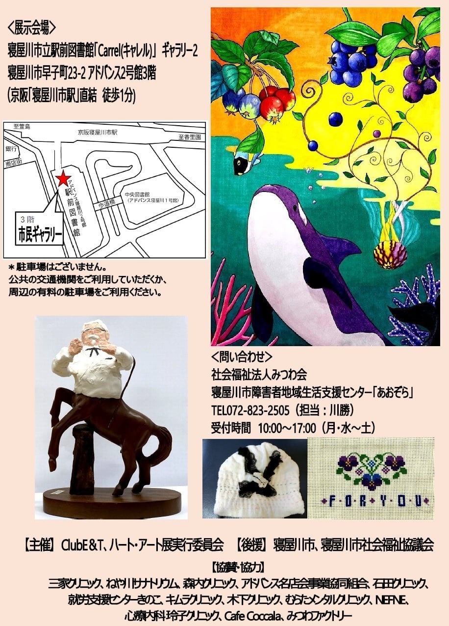 寝屋川市精神障害者地域交流事業「Club E&T」は、同じ病を持つ仲間同士の共同活動の場や、市民ボランティアとの交流スペースを促進、整備、在宅の精神障がい者の社会参加を支援する活動を取り組んできました。その活動の中から「アート」を通して発信するひとつの交流を、町のづくりのひとつとしい取り組んでいきたいという思いからスタートしました。以前は、大阪府が府域全域を対象に、大阪府ハートアート展が開催されていました。その名称を引き継ぐ形で、寝屋川市域に限定して、「寝屋川ハートアート展」を2015年から寝屋川市民ギャラリーで開催しはじめました。