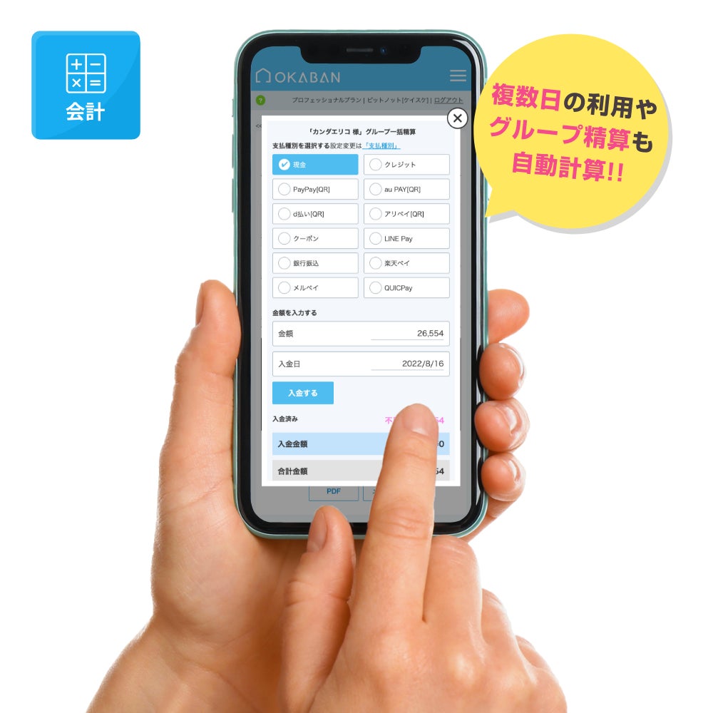 予約情報から自動で利用明細を作成するお会計機能。自動計算で計算ミスや入力漏れを防止します。