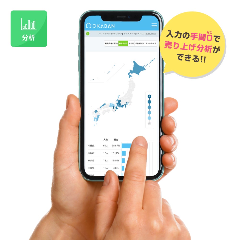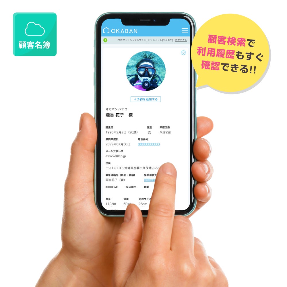 リピート率と顧客満足度の向上のために大きく貢献する顧客名簿。スタッフの入力なしで顧客情報を検索可能なデジタル化することで過去の利用履歴や連絡先がすぐに確認できます。また、クラウドで共有しているので全スタッフが場所を選ばず確認することができます。