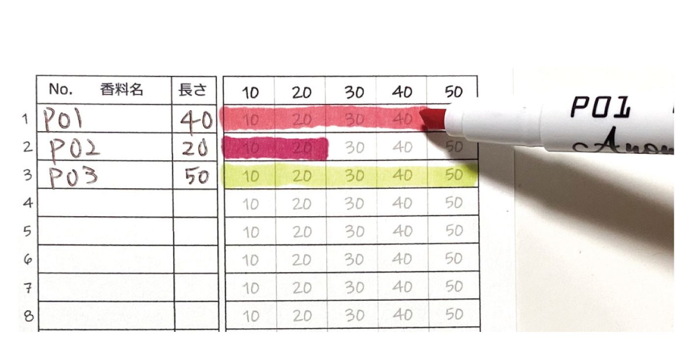 線を引き、塗った面積で香りの量を計量(10=10mm幅)