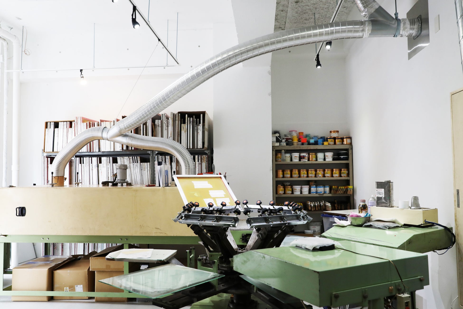 左:2F「ATELIER PMC」の縫製スペース / 右:1F「PMC HIGHINCOME」のシルクスクリーン印刷機