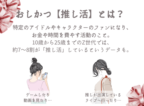 推し活とは特定のアイドルやキャラクターのファンになり、お金や時間をたくさん費やす活動で、Z世代(10歳から25歳まで)の約7〜8割が推し活をしていると言われています。平均して年間5〜10万円程度使うという調査結果もあり、年々大きなマーケットになっていることから多くの企業が推し活を意識した商品やキャンペーンを行うようになっています。