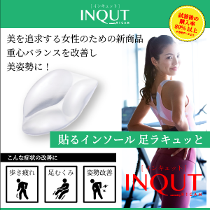 現代人の多くはかかと重心になっており、体に歪みができ、腰痛・ひざ痛の原因になっています。INQUTを使うことで、「かかと重心」が「足裏中央の重心」に自然と変化し、身体の軸が整えられます。その結果、足がスッキリみえたり、歩行時に余分な力を使わず足が楽になったりする効果が見込まれます。