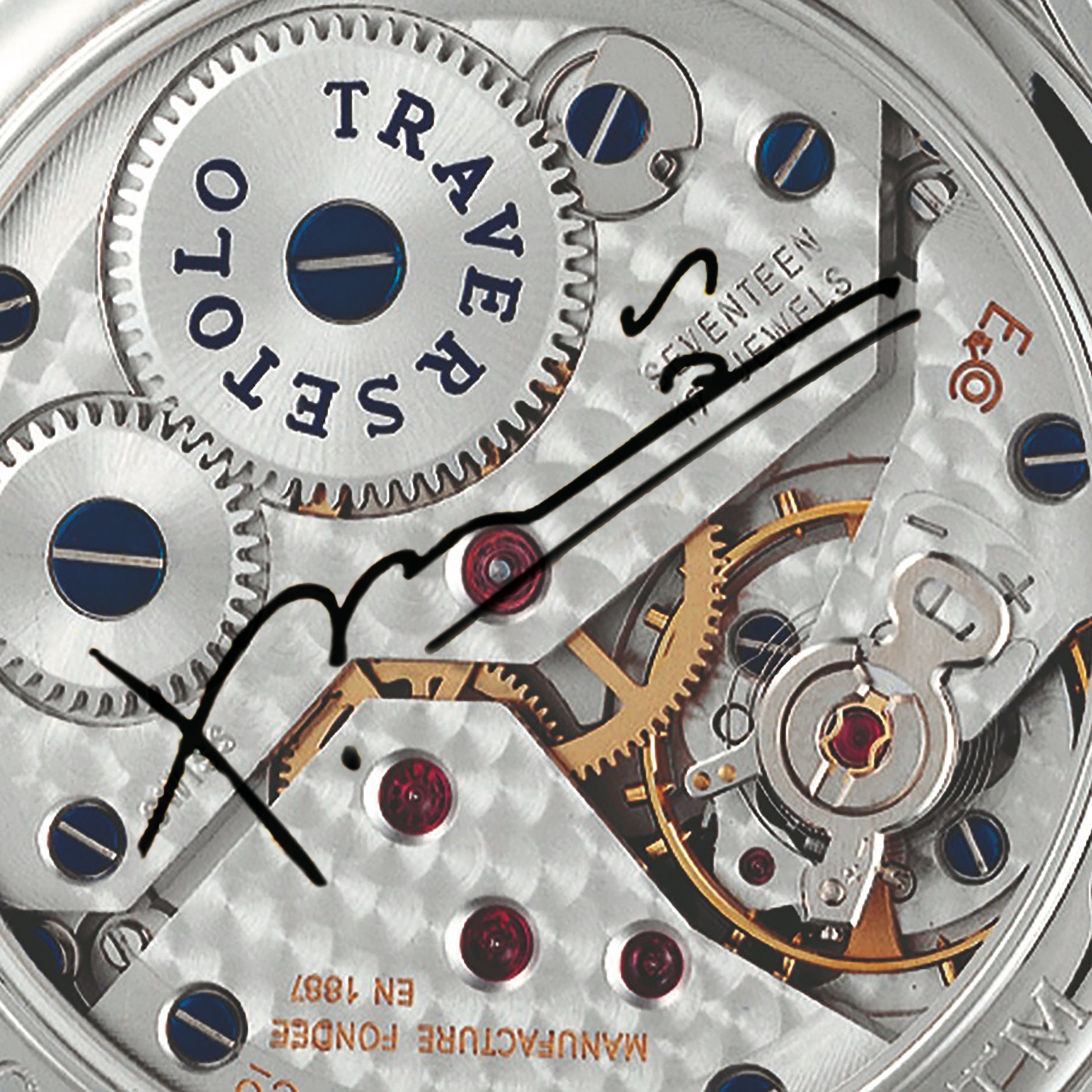 今回のモデルは、葉加瀬太郎氏の意見を取り込んだ実にユニークな特徴を備えています。 『トラベルセトロ』コレクションの特徴的なブラックダイヤルのアラビア数字の8と2には黒 のスーパールミノバが塗られており、これは葉加瀬太郎氏、自身が監督を務めるレーベル HATSの名前の同音であるHA (8) TS(2)、から着想を得ています。