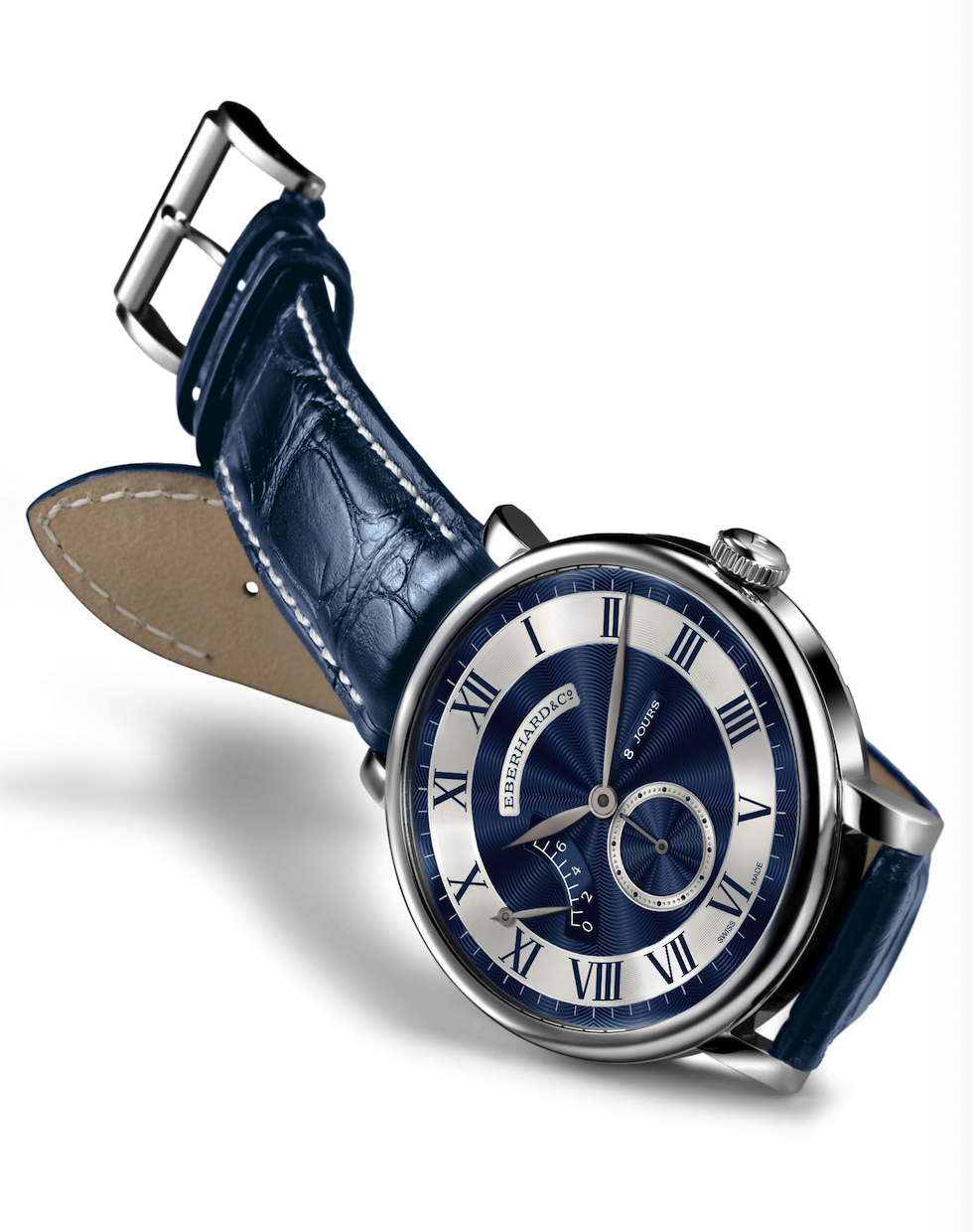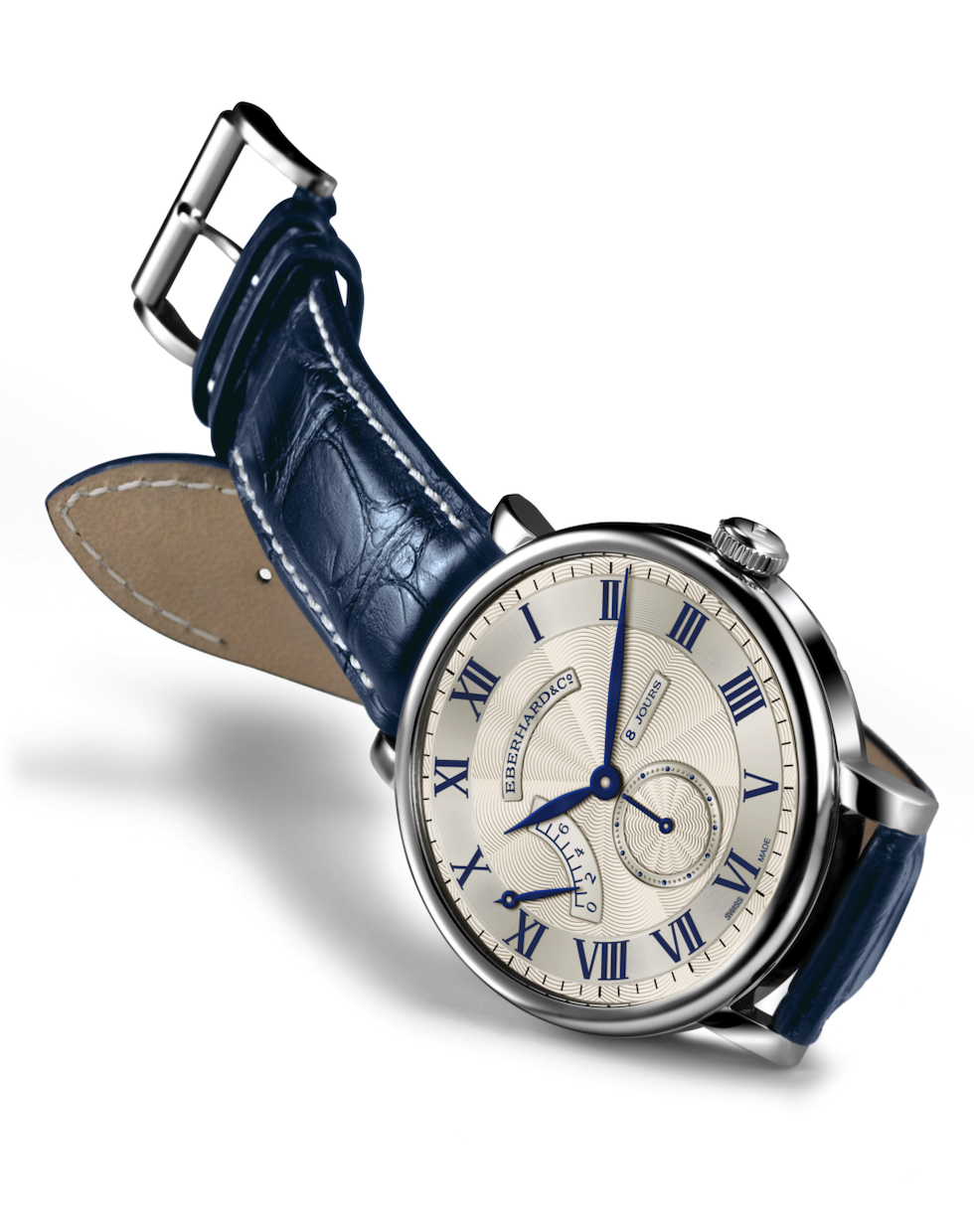 文字盤は伝統的なデザインで、9時位置の目盛りでパワーリザーブが表示されます。技術と美学が見事に融合し、品質のバランスがとれた『8ジュール グラン・タイユ』は、クラシック時計の愛好家にとっても人気のあるモデルの一つです。今回発表するモデルは文字盤にはギョーシェ彫りが施されており、二色からお選びいただけます。ローマ数字と洗練されたカウンター、そしてヴィンテージスタイルのロゴが、時代を超えたエレガントな外観で、オフィサーズ・ウォッチに相応しい仕上げとなっています。