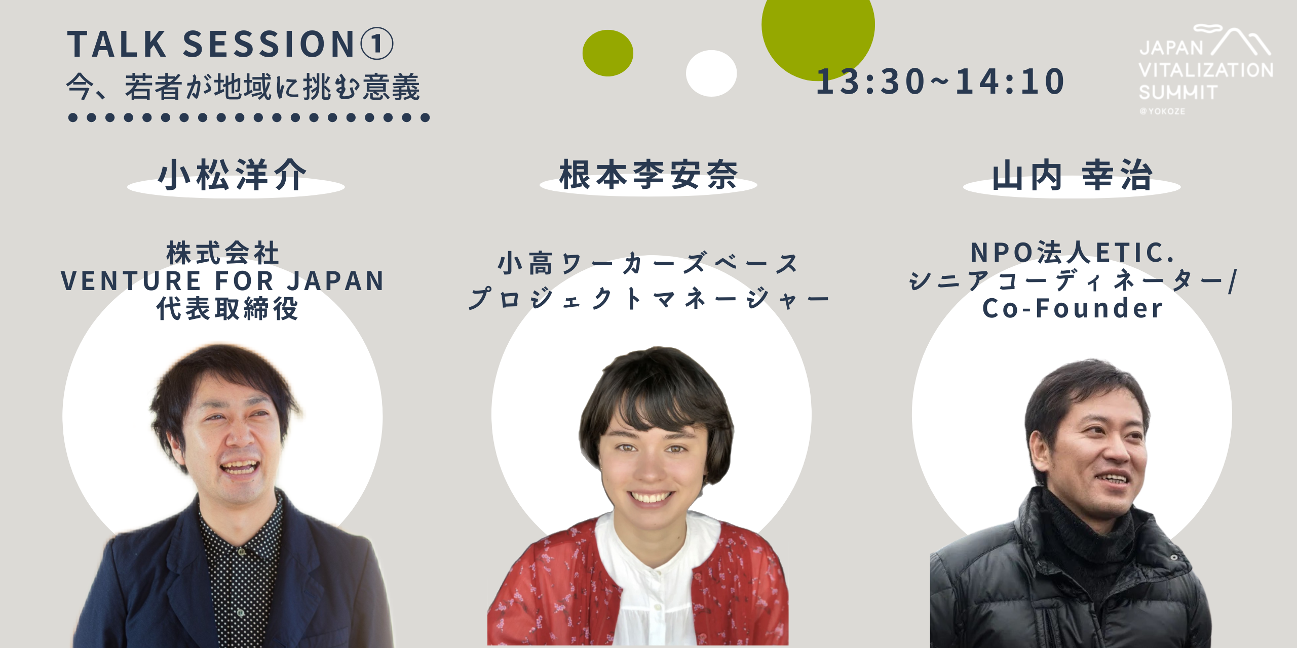 小松洋介氏(株式会社VENTURE FOR JAPAN 代表取締役)、根本李安奈氏(小高ワーカーズベースプロジェクトマネージャー)、山内幸治氏(NPO法人ETIC.)