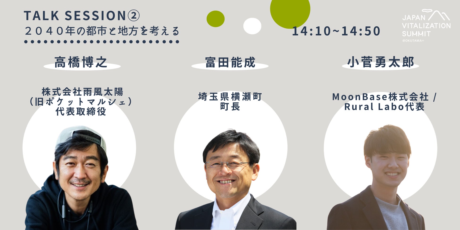 高橋博之氏(株式会社雨風太陽(旧 ポケットマルシェ)代表取締役)、富田能成氏(横瀬町 町長)、小菅勇太郎(Rural Labo代表)