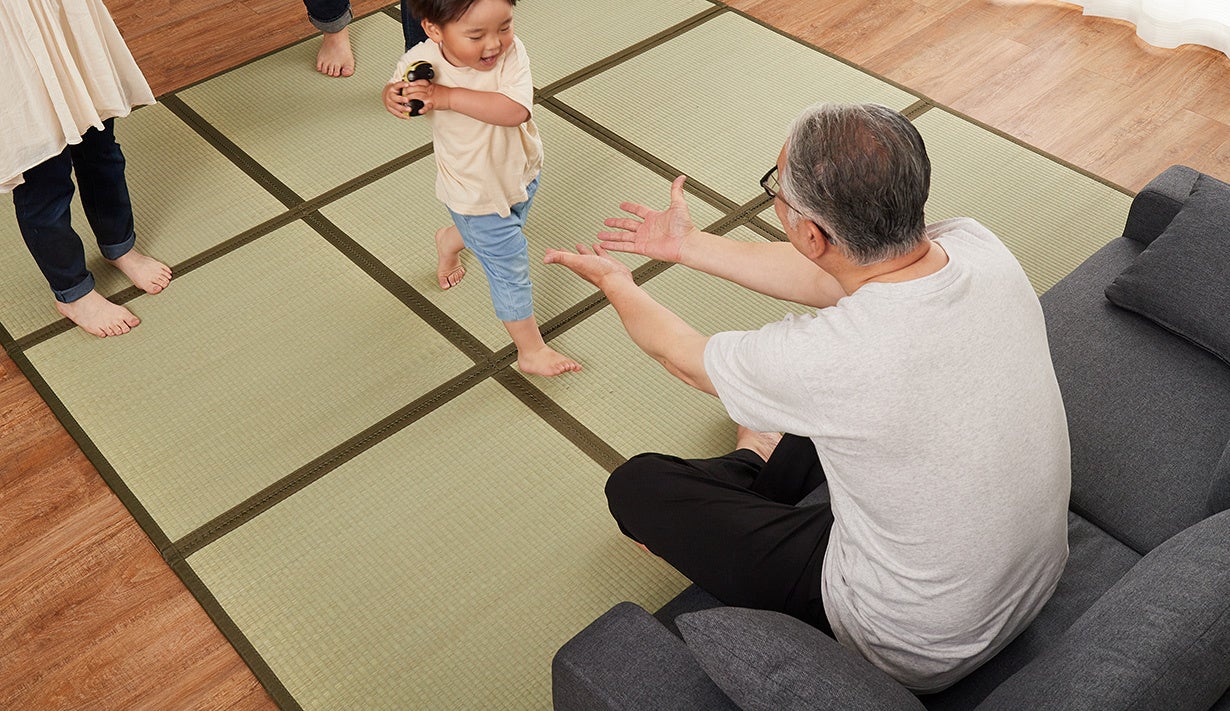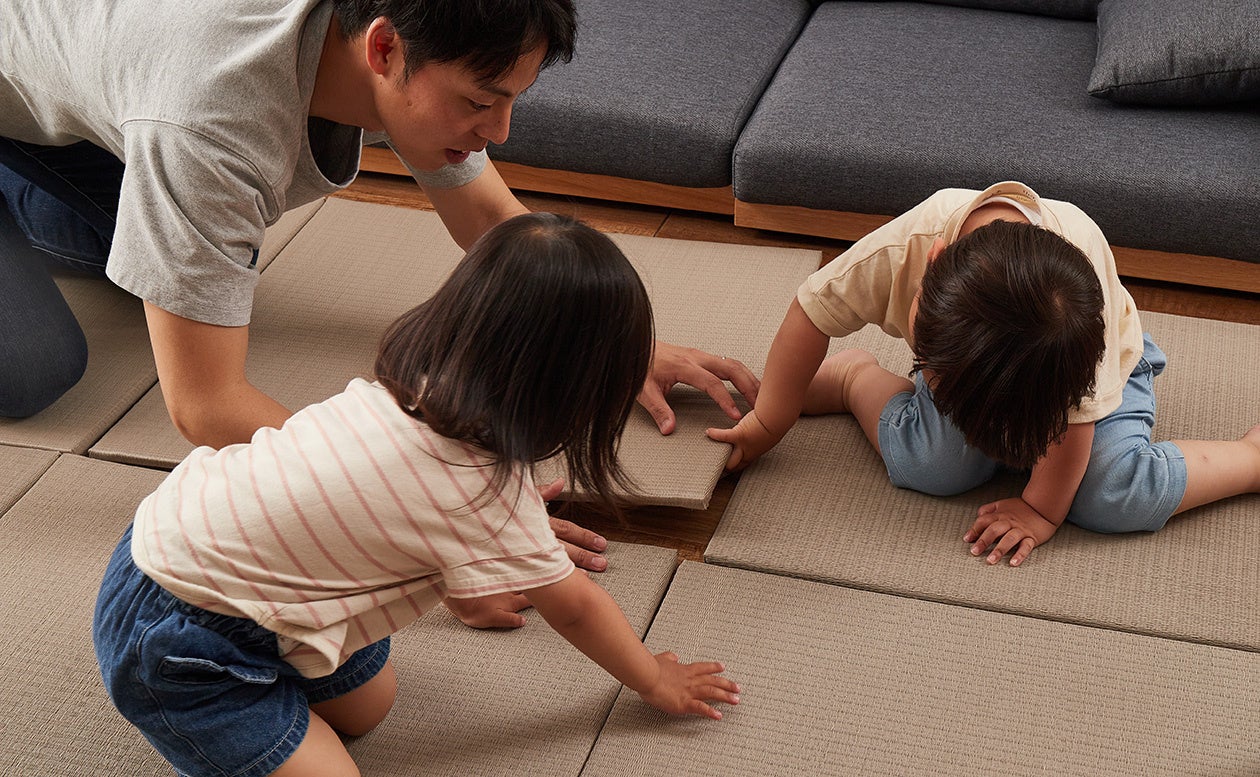 半畳サイズの畳を9枚縫い繋げているので、ずれる心配がありません。隙間も少ないのでゴミも溜まりにくくなっています。子どもたちにめくられて、いつの間にかずれている……、なんてこともありません。
