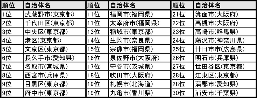 1位・武蔵野市、2位・千代田区、3位・中央区、都内以外では愛知県長久手市(6位)が最上位
