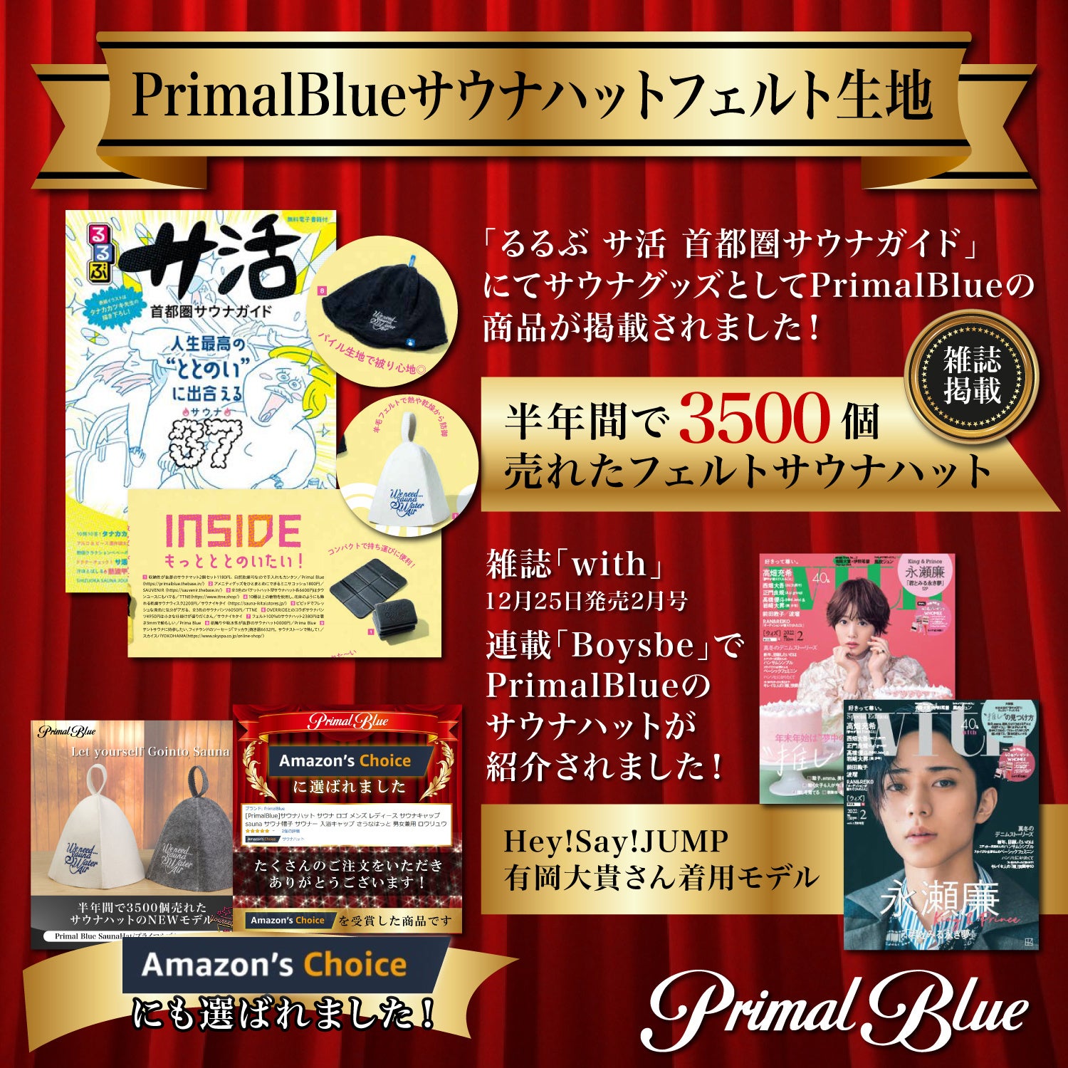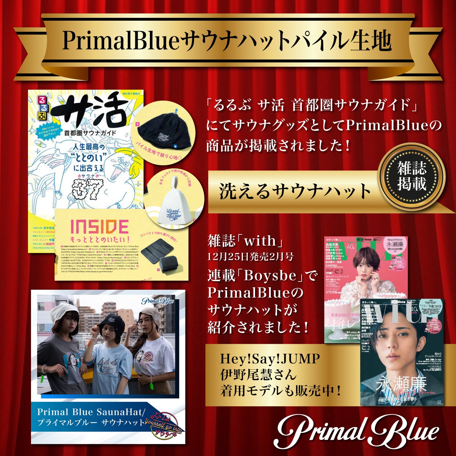 with2月号ではHey!Say!JUMPの伊野尾慧さん、有岡大貴さんにPrimalBlueのサウナハットを着用していただけました。