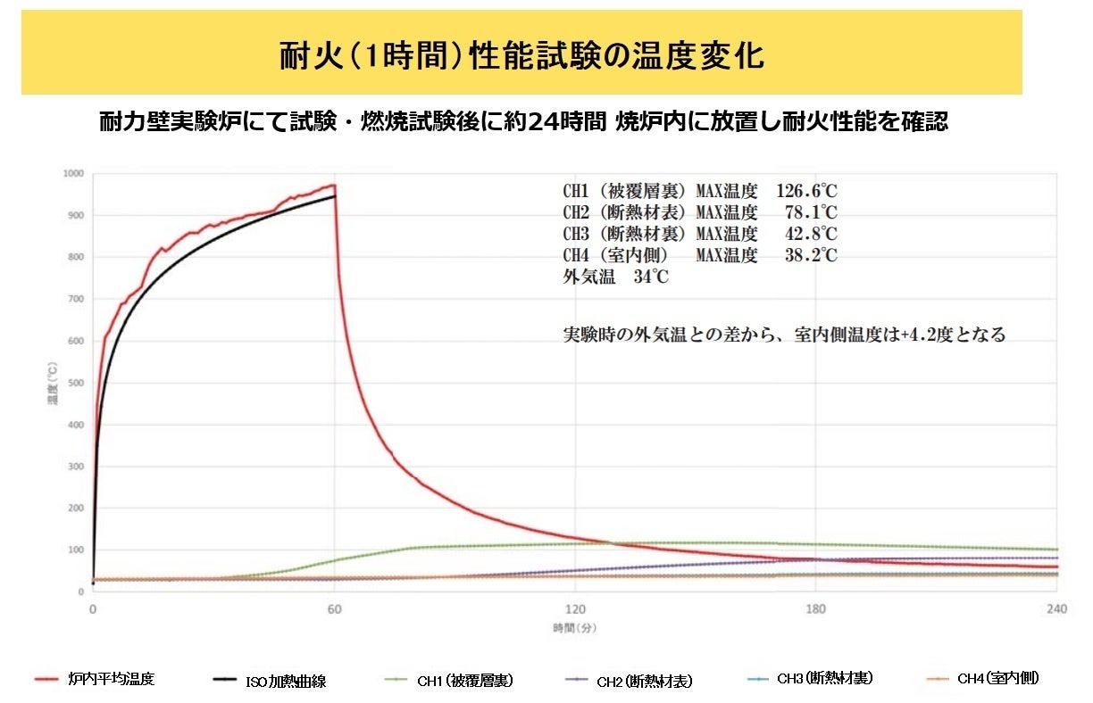 ISO基準に則った耐火構造物試験を実施。1時間1000℃の加熱試験で、外部温度が1000℃に達しても室内温度は最大で外気温に対して4℃程度の上昇でした。さらに、外部の表面材である耐火LVL(50mm)が黒く炭化するのみで、耐震構造部材は影響を受けないことが確認されました。
