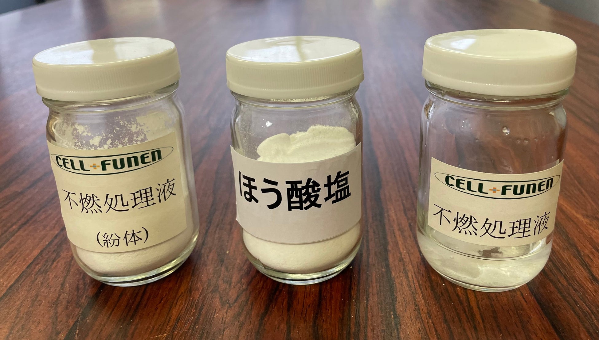 木材にホウ酸などを用いた不燃処理液(セルフネン液:写真右)を特殊技術により含浸(がんしん)することで 、火があたっても炎を出して延焼することなく、煙や有毒なガスの発生を抑えます。※特許取得済