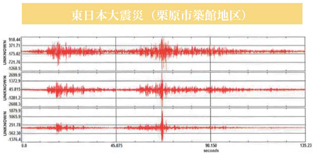 近年の3つの大地震の実際の地震波を再現した耐震・振動試験(国立研究開発法人 土木研究所)を実施。三次元大型振動台の底盤と「グラセーフ」の屋根部に加速度変換機を固定し、振動中の加速度データを収録した結果、加振台と「グラセーフ」の変位波形の相関関係が類似しており、亀裂や損傷もないことが実証されました。